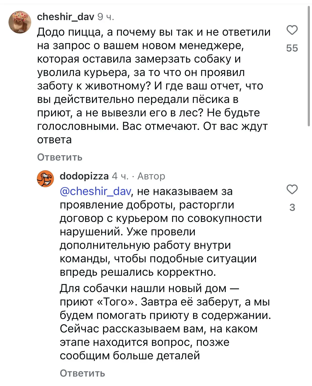 Если бы в Додо был бы конфликтолог или медиатор, он бы смог оценить динамику и сказать: «Друзья, видим, разбираемся, благодарим сотрудника за неравнодушие». Но поскольку такого нет, они начали объяснять, что курьера, дескать, и так собирались уволить, а собаку отловят и сдадут в приют.