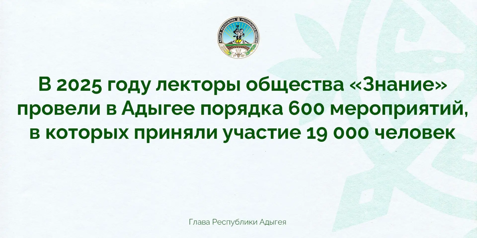 Этот успех является закономерным результатом активной образовательно-просветительской деятельности регионального родительского комитета и всех членов «Знания» в Адыгее. Только в прошлом году его лекторы провели в республике порядка 600 мероприятий. Около 19 тысяч жителей региона приняли участие в популярных лекциях, викторинах, тематических кинопоказах и интеллектуальных играх.