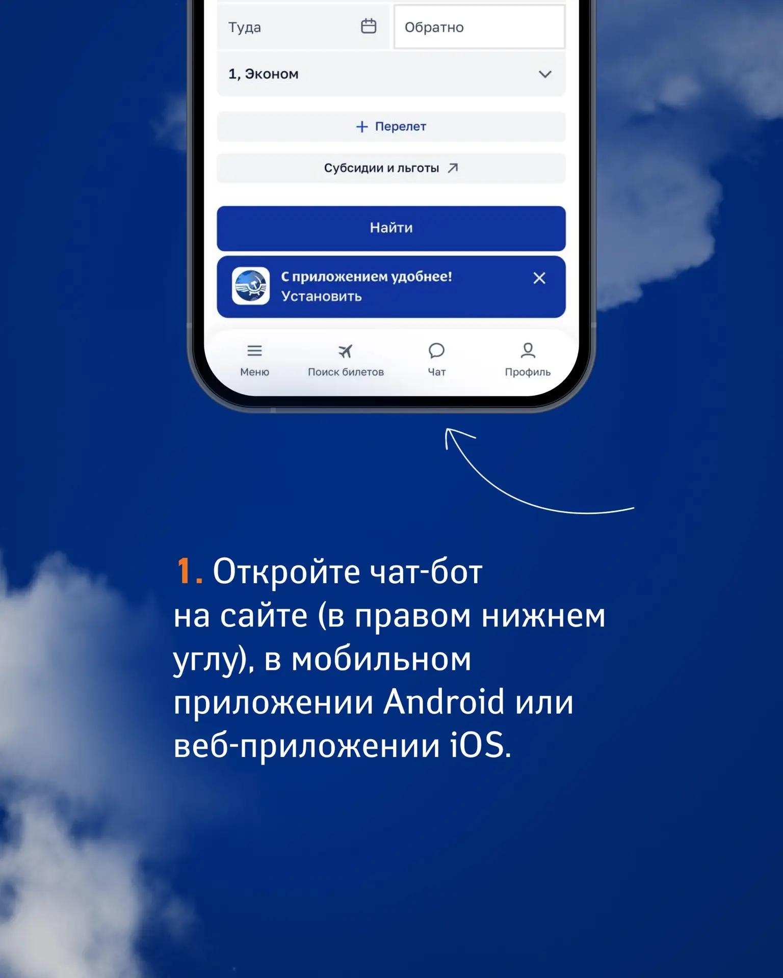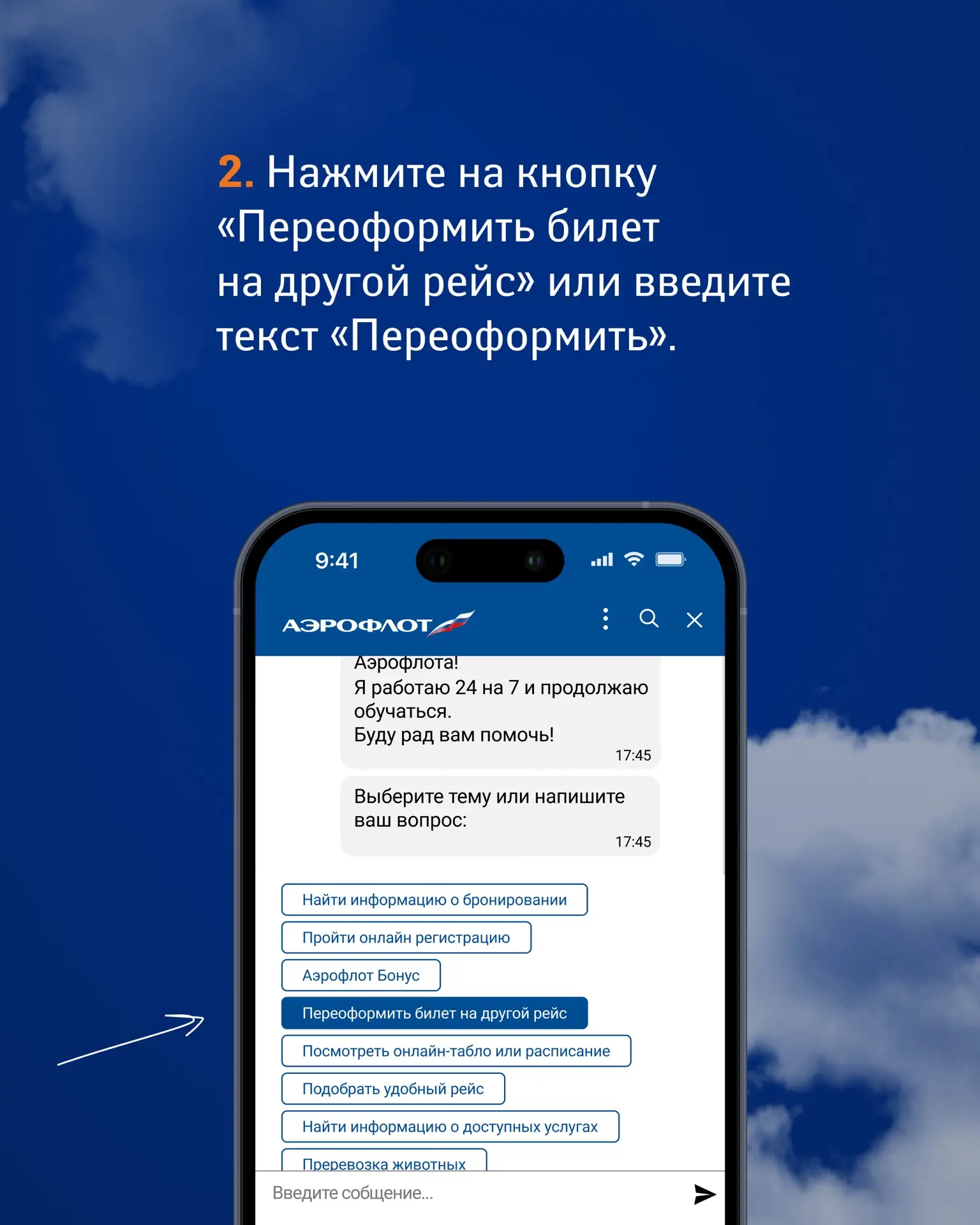 Нажмите на иконку помощника на aeroflot.ru или в приложении и следуйте подсказкам. Подробности — в карточках.