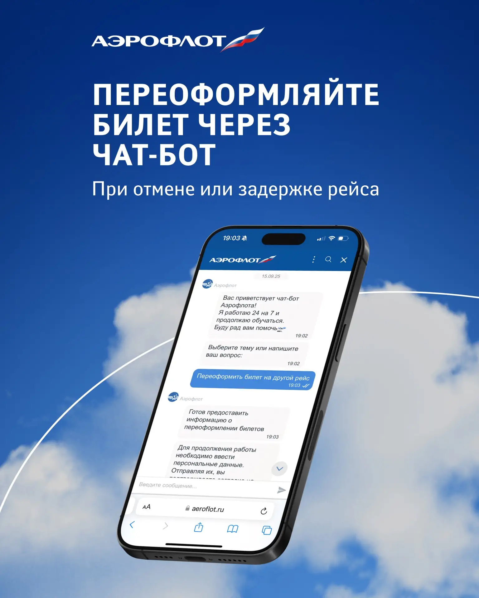 При вынужденной отмене, переносе, задержке рейса или пересадке на другой, вы можете переоформить билет прямо в чат-боте — быстро, без обращения в контакт-центр или офис продаж.