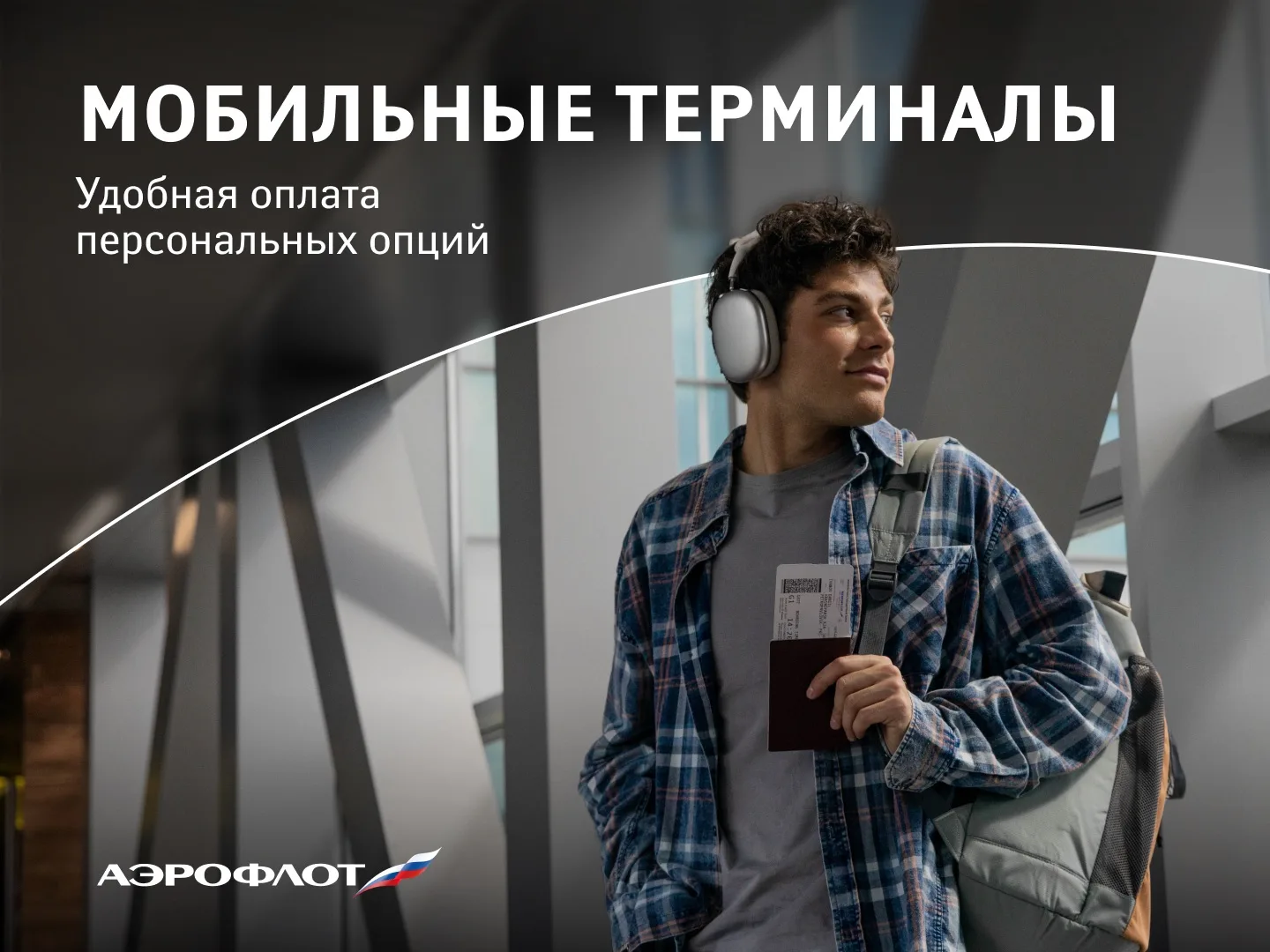 На стойках регистрации и в зонах вылета в аэропортах Москвы (Шереметьево), Санкт-Петербурга и Красноярска есть мобильные терминалы для удобной оплаты персональных опций на наших рейсах.
