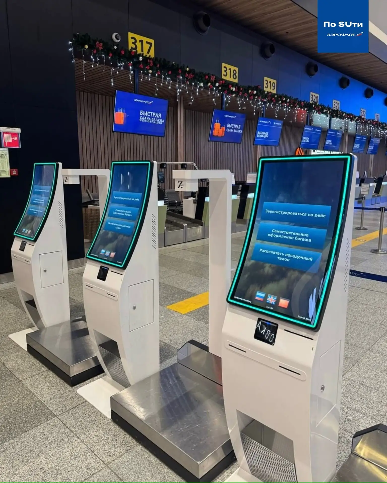 Стойки саморегистрации оборудованы большими сенсорными экранами с удобным интуитивным интерфейсом. Если у путешественника возникнут вопросы, помогут работники Аэрофлота, которые постоянно дежурят возле киосков.