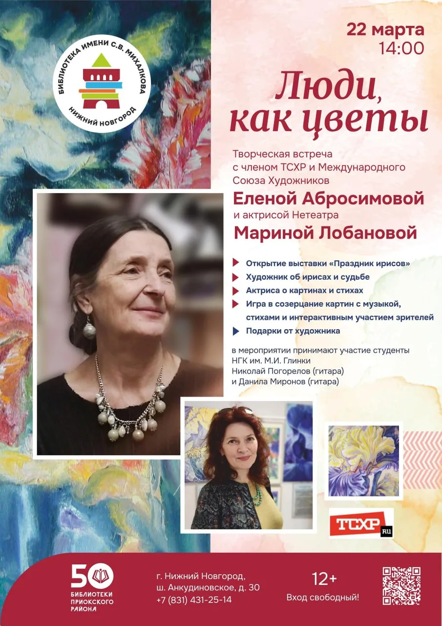 🔹Творческая встреча с членом ТСХР и Международного Союза Художников Еленой Абросимовой и актрисой Нетеатра Мариной Лобановой;