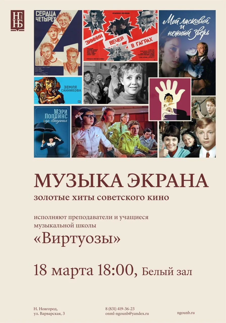 Со сцены Белого зала для гостей прозвучат золотые хиты советского кино в исполнении преподавателей и учащихся музыкальной школы «ВИРТУОЗЫ».