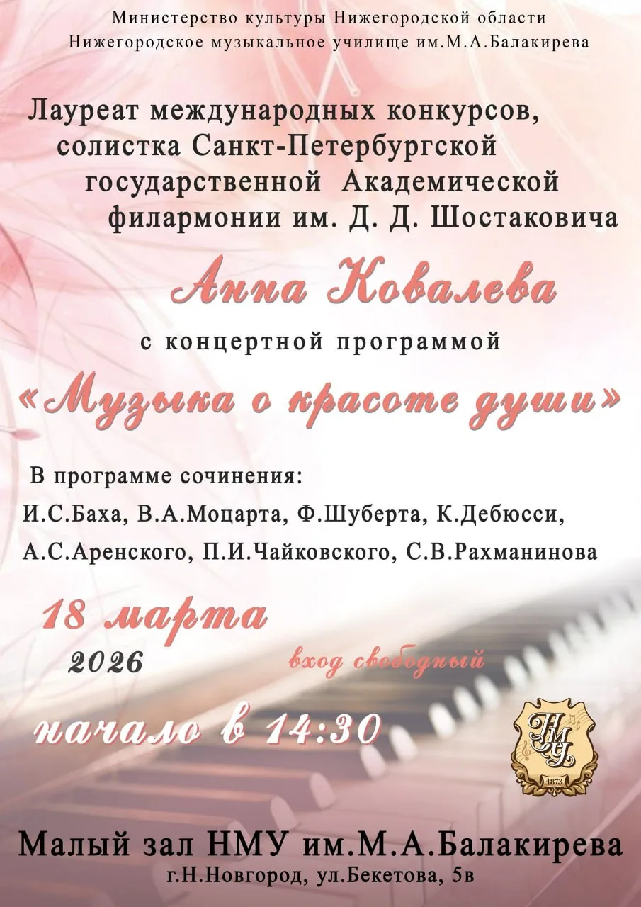 В программе сочинения: И.С. Баха, В.А. Моцарта, Ф. Шуберта, К. Дебюсси, А.С. Аренского, П.И. Чайковского, С.В. Рахманинова.