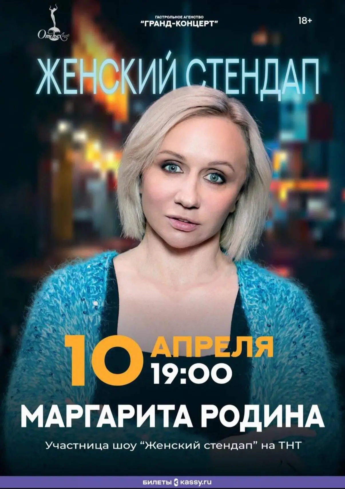 Маргарита Родина — звезда шоу «Женский стендап» на ТНТ и мать троих детей, которая своим примером доказывает, что после 40 жизнь только начинается! Ее сольный концерт — это не просто выступление, а искренний и веселый диалог с Вами, дорогие зрители, о том, как оставаться в отличной форме и сохранять бодрейшее чувство юмора.