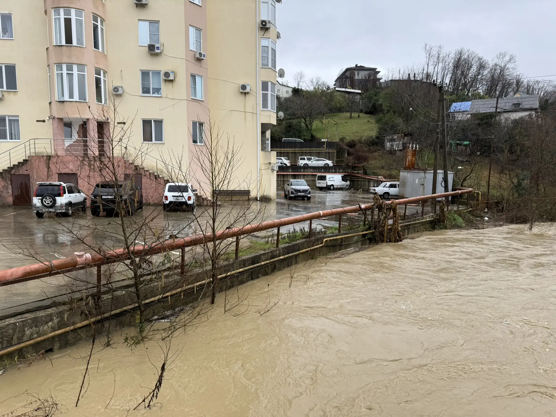 Возле дома №16А вода частично зашла на придомовую парковку. У многоквартирного дома №26/5 есть вероятность дальнейшей активизации оползневого процесса, здесь находится техника на случай подвижки грунта.