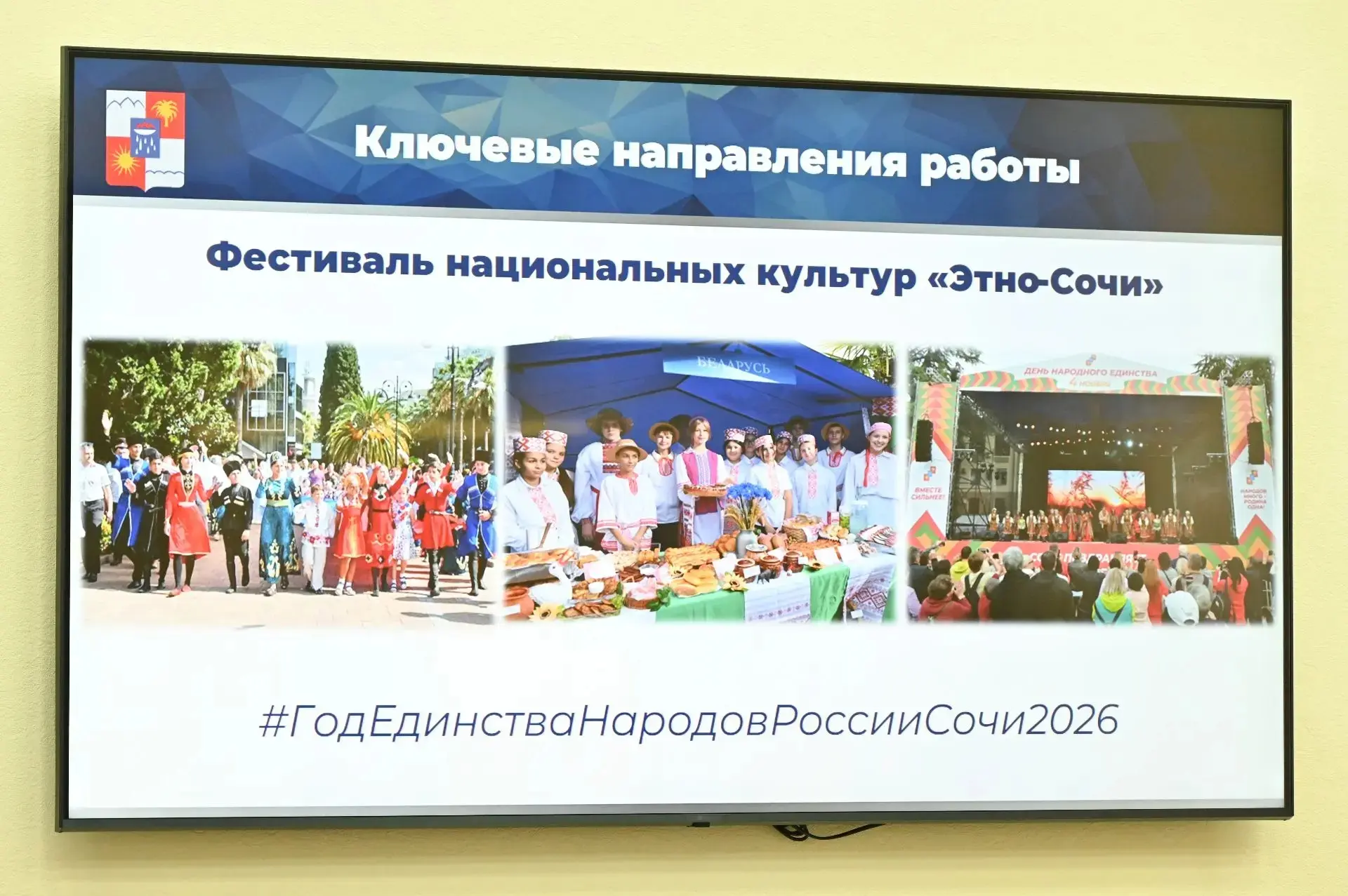 Год олимпийского триумфа станет логичным продолжением Года единства народов России. Спорт и культура являются универсальными языками, которые во все времена объединяли людей, укрепляя межнациональную дружбу. Как и во время Игр, многонациональность Сочи должна вновь стать нашей визитной карточкой, демонстрирующей миру взаимное уважение разных народов и религий, веками живущих бок о бок в единстве.