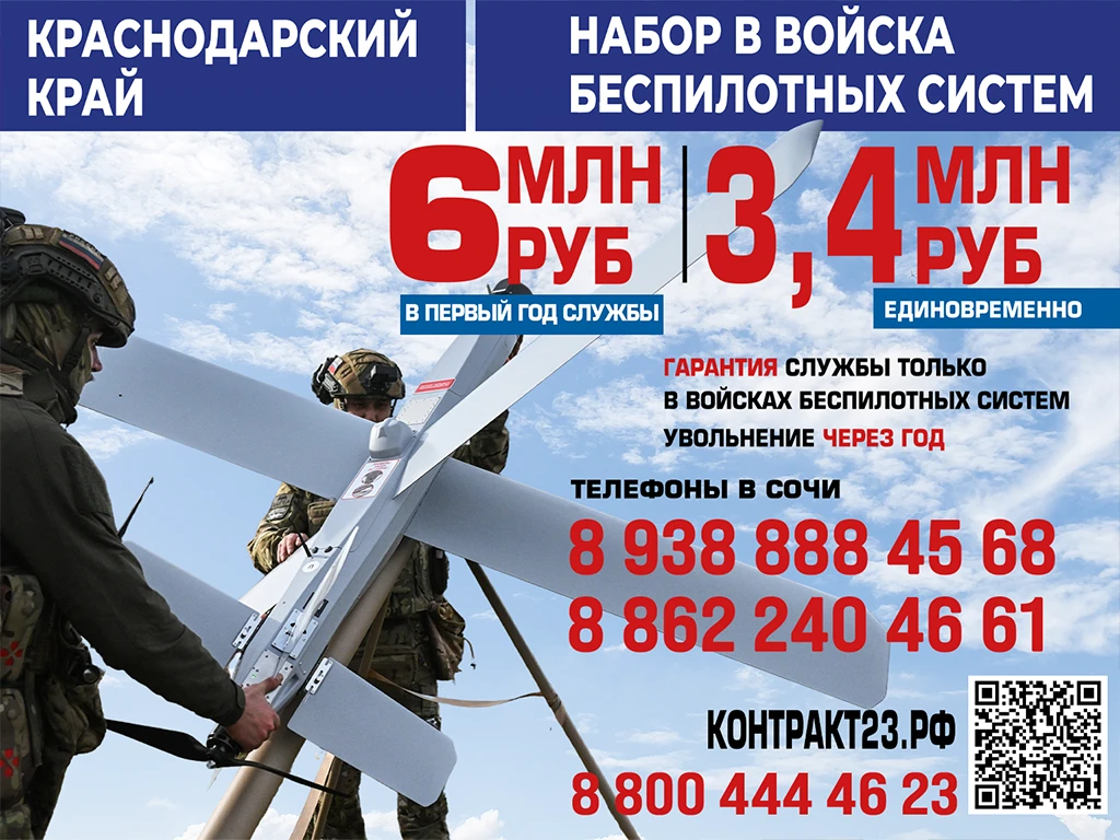Мы с гордостью смотрим на тех, кто в это непростое для страны время принимает для себя верное и мужественное решение – встать на защиту Родины. Это трудный, но по-настоящему достойный выбор настоящих патриотов. Обращаюсь к каждому жителю города, кто чувствует в себе силы и ответственность – сегодня самый подходящий момент, чтобы всерьёз рассмотреть для себя службу по контракту. С 1 февраля 2026 года для сочинцев, заключивших контракт с Минобороны, предусмотрена выплата 3,4 миллиона рублей. Всю информацию можно получить по круглосуточному телефону для консультаций и содействия в обучении и поступлении на военную службу по контракту в Сочи: 8(938) 888-45-68 и 8(862) 240-46-61.