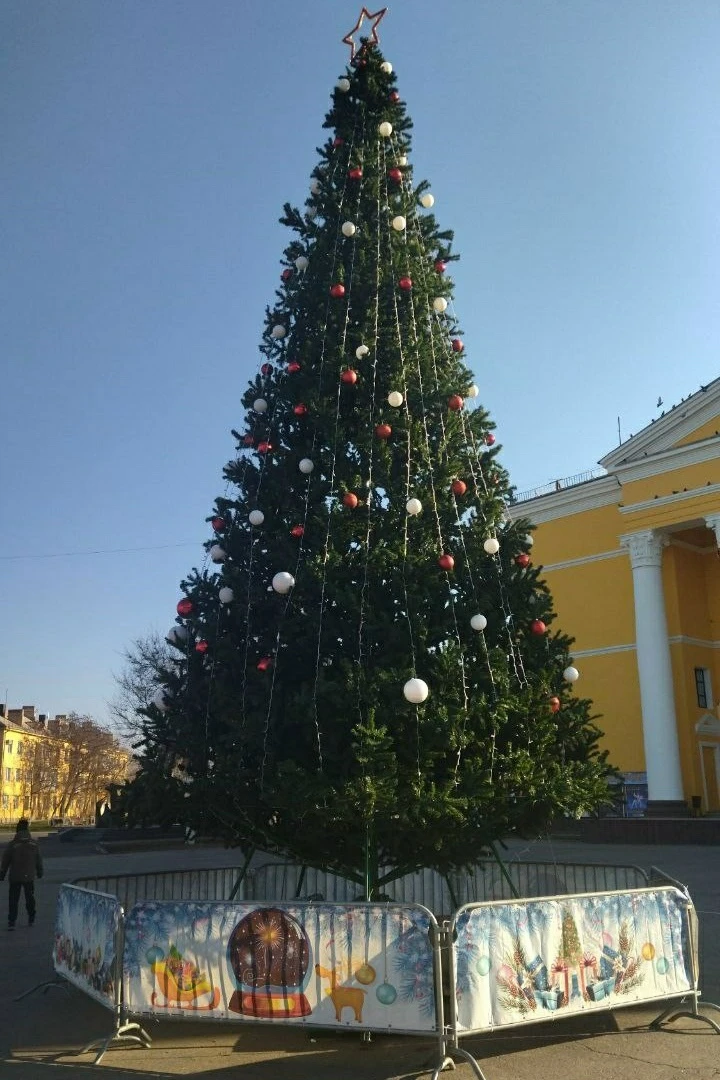 🤗Сотрудники «Чистого города» завершили установку главного атрибута Нового года на площади Ленина. Десятиметровую искусственную красавицу в этом году украсили белыми и красными шарами, а также гирляндой с красной звездой на макушке. Декоративное ограждение поставили с изображением новогодних персонажей.