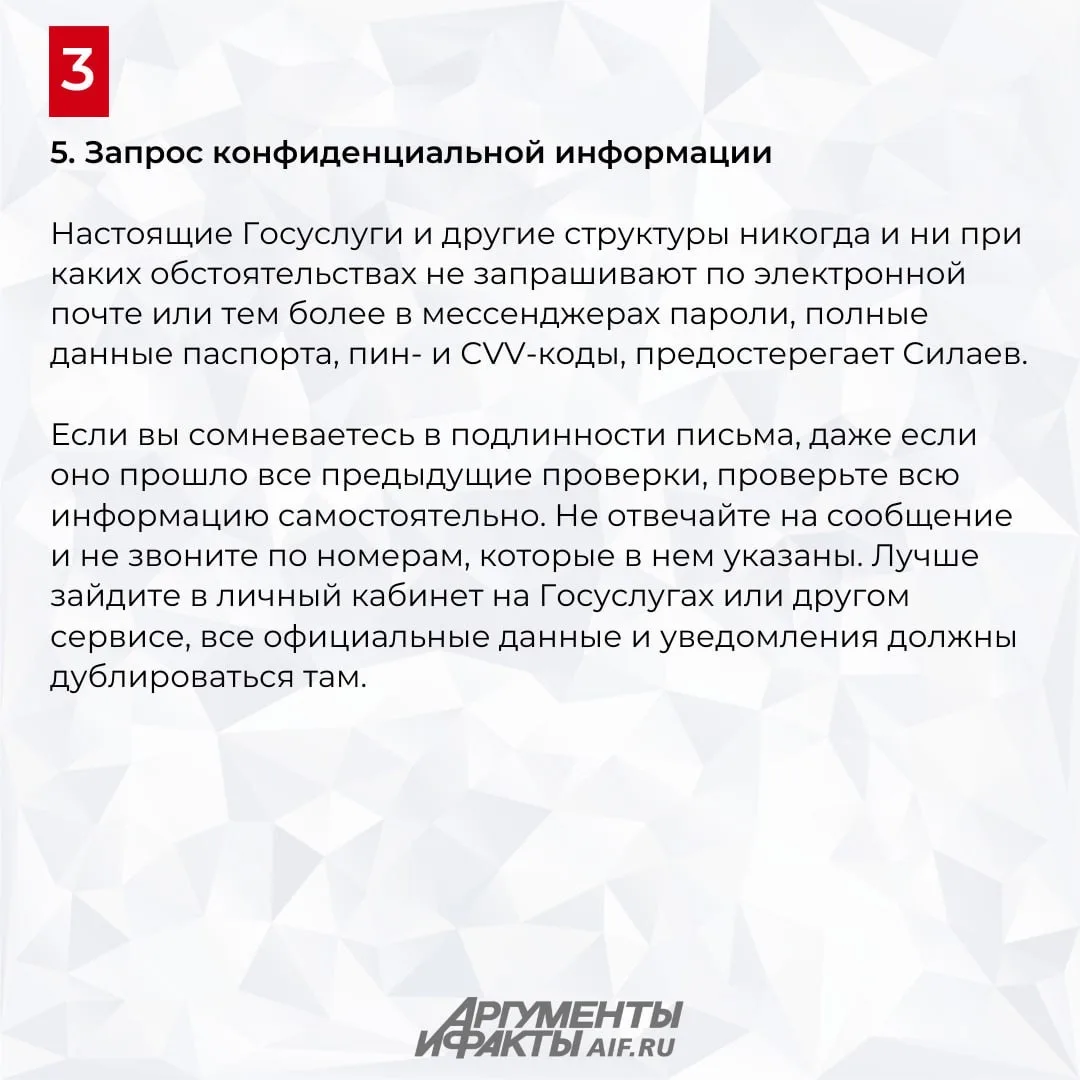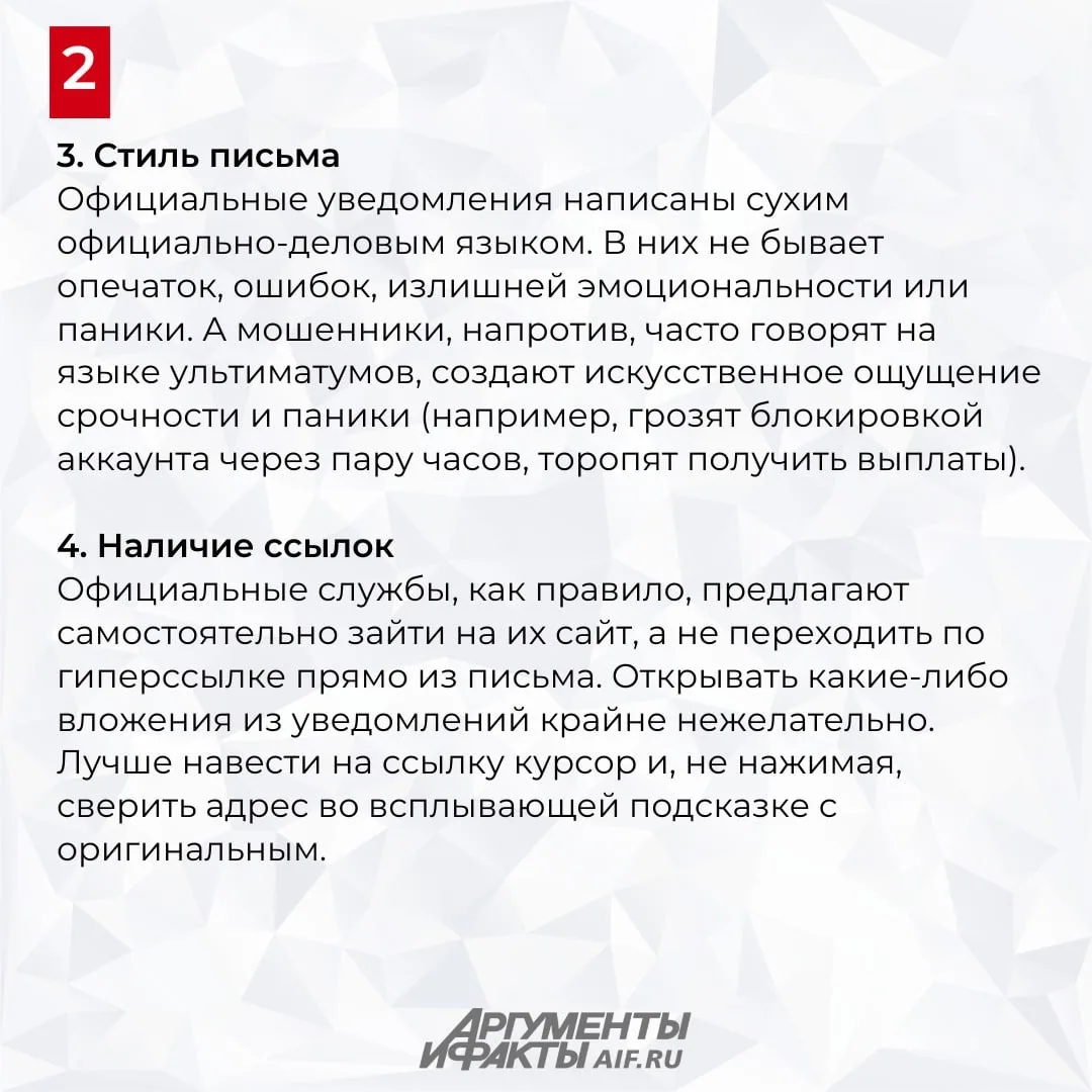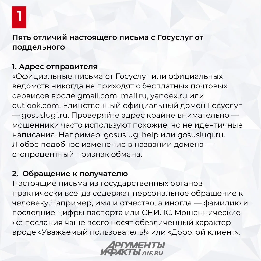 Официальные уведомления от Госуслуг никогда не приходят с доменов gmail.com или mail.ru, а человеку в них не угрожают блокировками. Цель у таких уведомлений всегда одна — завладеть персональными данными человека, его деньгами или учетной записью, предупреждает эксперт. Отличить официальное обращение от фишингового можно по нескольким признакам — в карточках.
