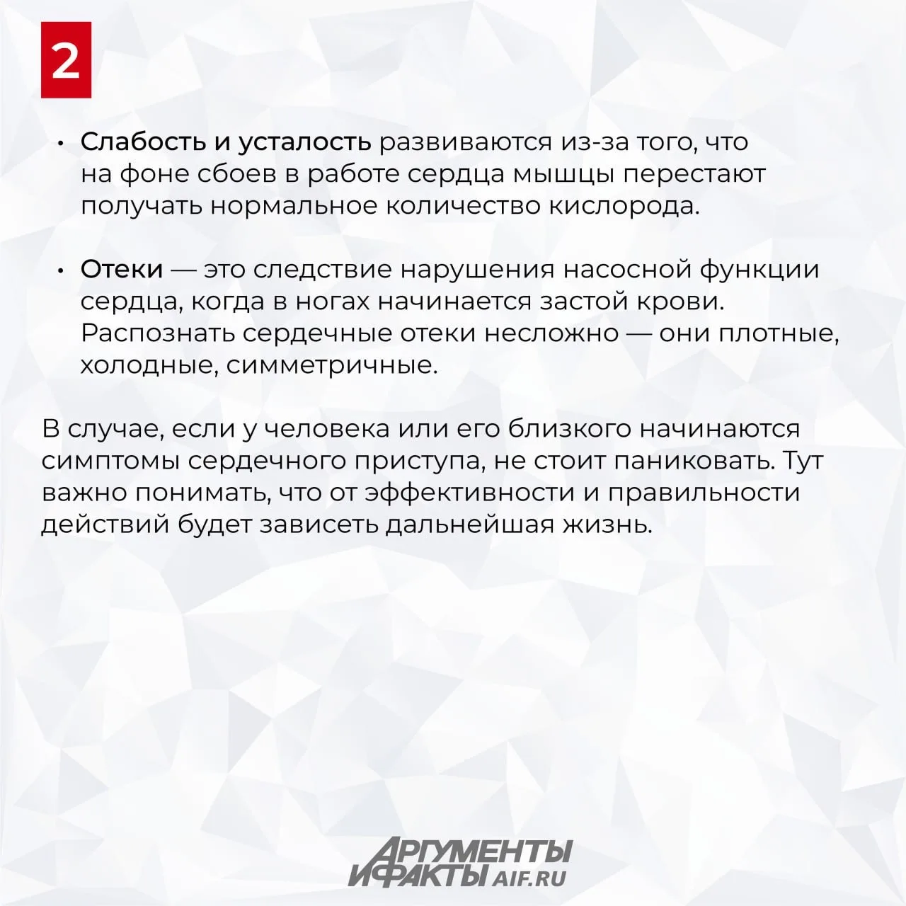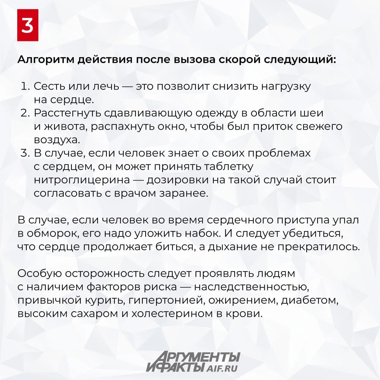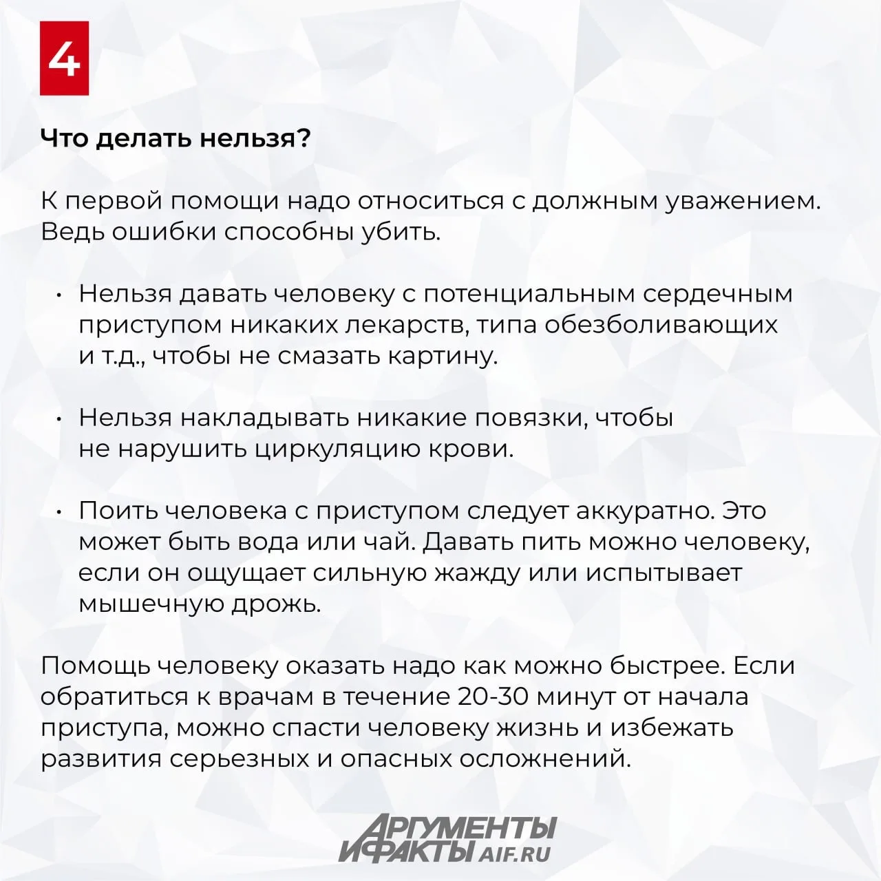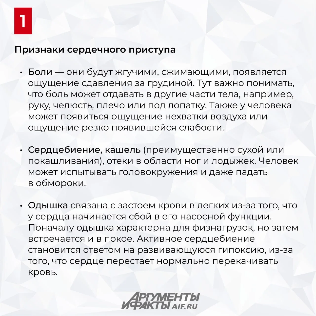 Любая боль в области сердца связана с сердцем, пока не доказано обратное, объяснил АиФ кардиолог Азизхон Аскаров. А это значит, что при появлении настораживающих признаков следует как можно скорее обращаться к врачу или вызвать скорую. Если у человека начинаются симптомы сердечного приступа, не стоит паниковать. Нужно понимать, что от эффективности и правильности действий будет зависеть дальнейшая жизнь. Подробнее рассказали в карточках.
