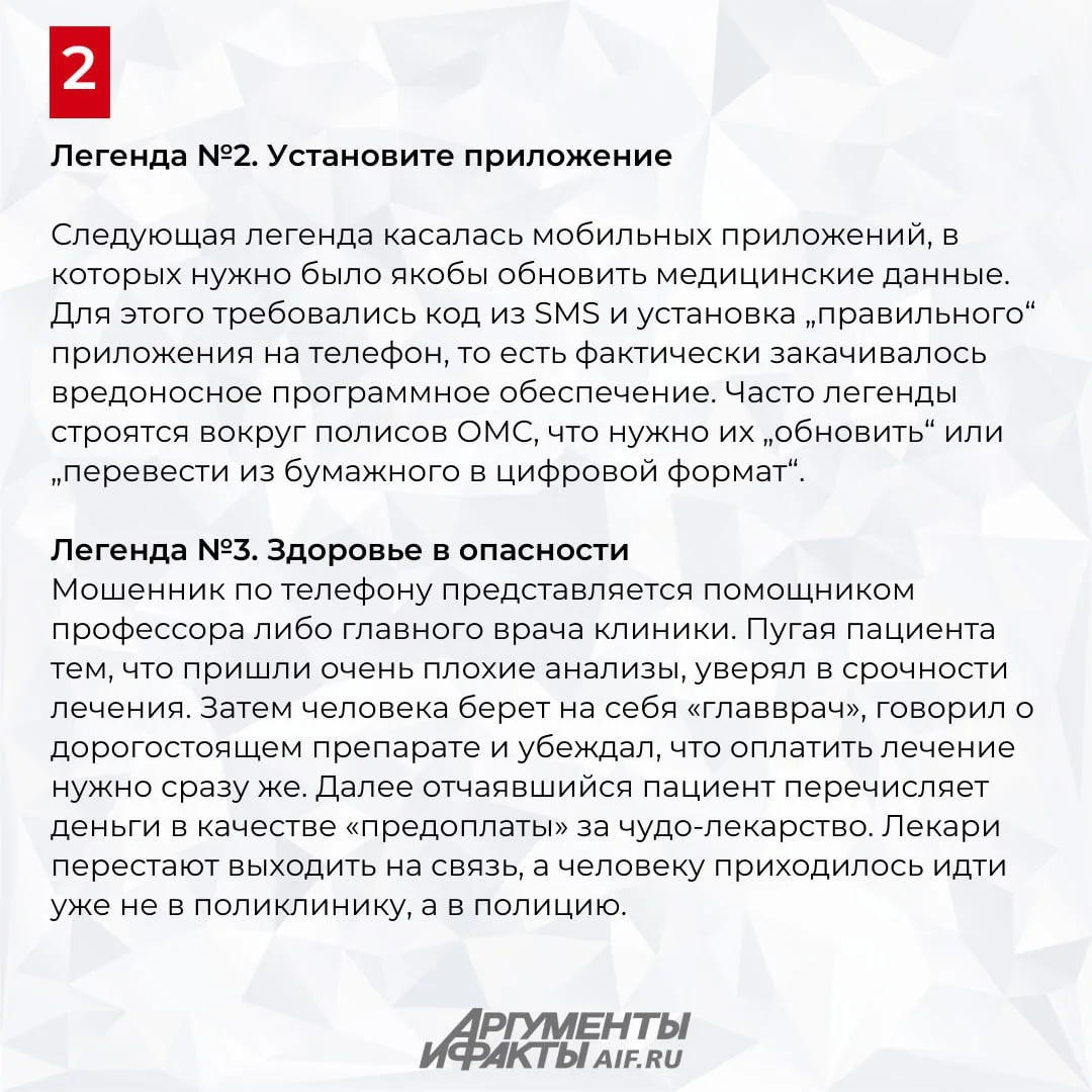 Мошенники начали обзванивать россиян, чтобы пригласить их на «пересдачу» медицинских анализов, рассказала замруководителя проекта Народного фронта «За права заёмщиков», куратор платформы «Мошеловка» Алла Храпунова. Как происходит обман и какие легенды придумывают аферисты — читайте в карточках и на сайте АиФ.