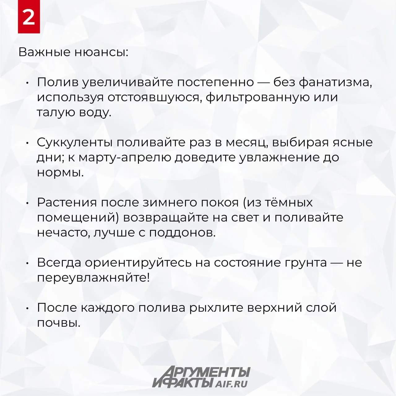 Солнечных дней становится всё больше, увеличивается и длина светового периода. В феврале растения пробуждаются от зимнего покоя и начинают готовиться к активному росту. Как обеспечить им правильный уход в этот период, чтобы они радовали пышной листвой и здоровым видом, рассказали в карточках.