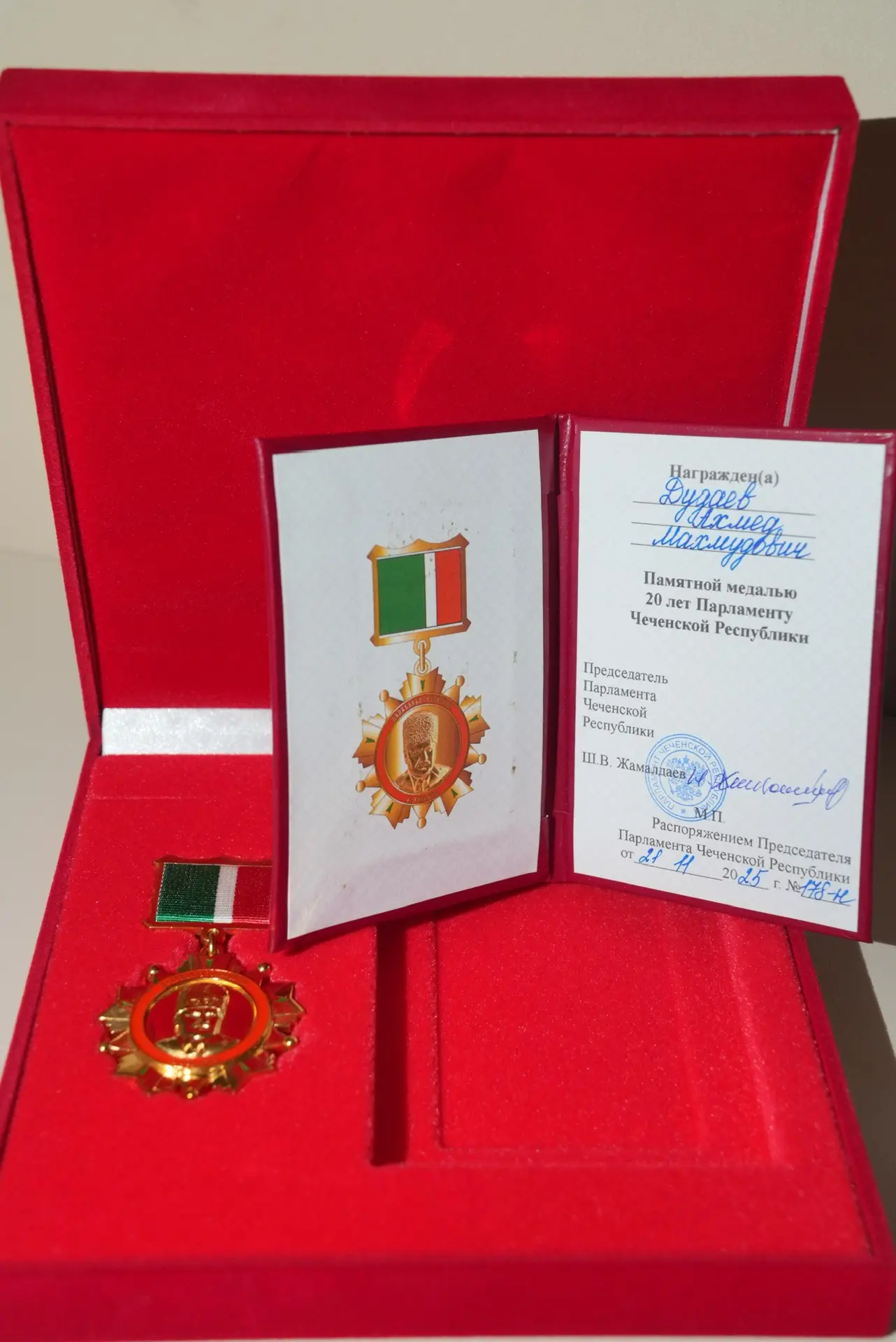 Большая честь получить памятную медаль «20 лет Парламенту Чеченской Республики»!