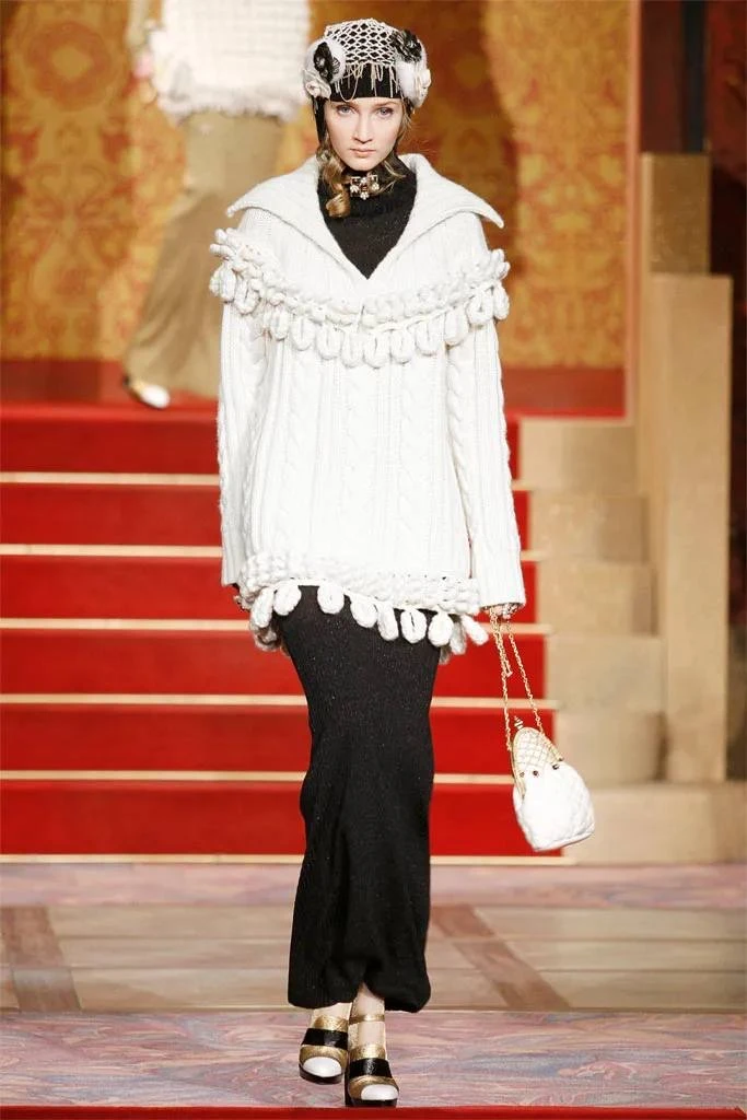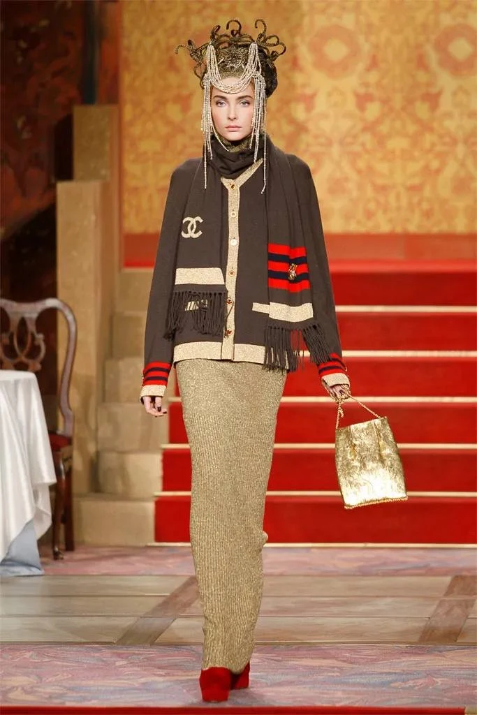 Скажу честно, коллекцию сложно назвать в привычном смысле красивой. Но, например, кокошники смотрятся круто и интересно. Свитер с надписью «Шанель» как будто купили на рынке, но ирония в том, что это оригинал)) В общем, что-то в этом есть.