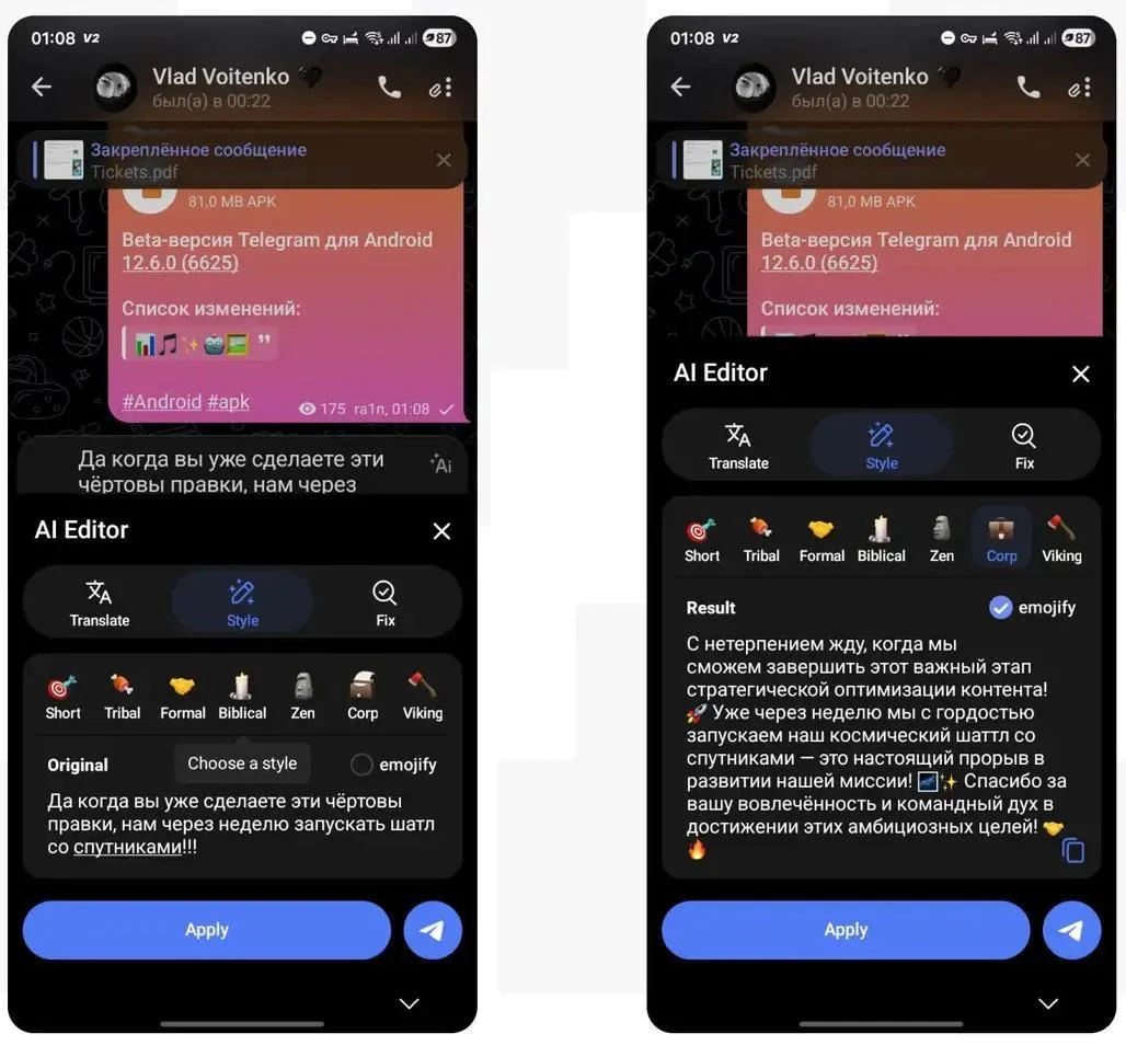 С его помощью можно исправлять ошибки, менять стиль текста или переводить его на другой язык — все в интерфейсе мессенджера.