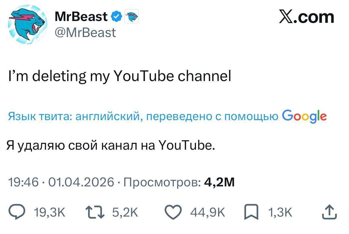 ⚡️MrBeast удаляет свой YouTube-канал — по крайней мере, он сам сообщил об этом в Твиттере.