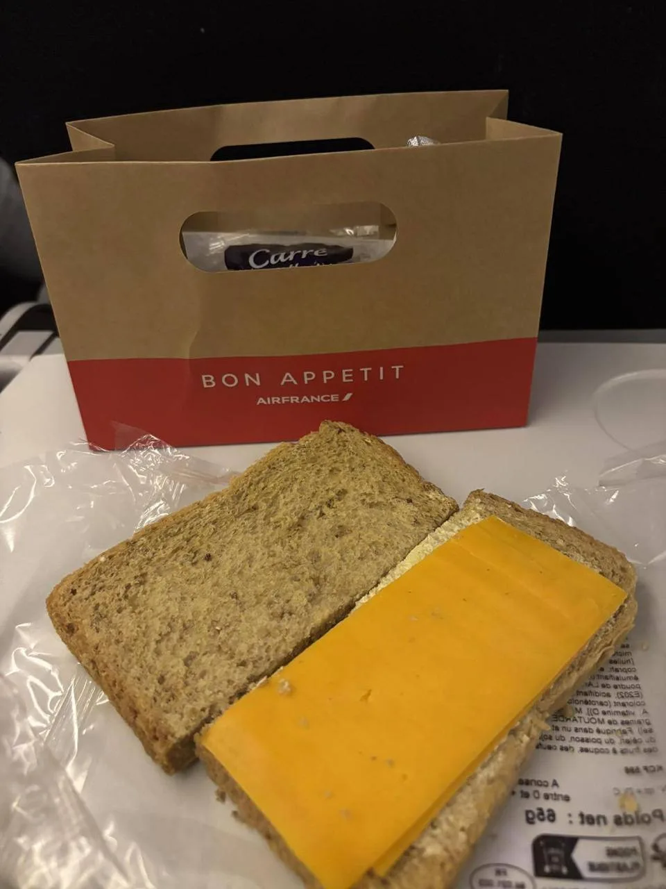 Французская кухня не в своих лучших проявлениях. В сети раскритиковали национальную авиакомпанию Air France за этот скудный паек. Один из пассажиров рейса Париж — Нью-Йорк показал свой перекус на борту — пара тонких ломтиков сыра и кусочек хлеба с непонятным соусом. Без хруста французской булки, получается