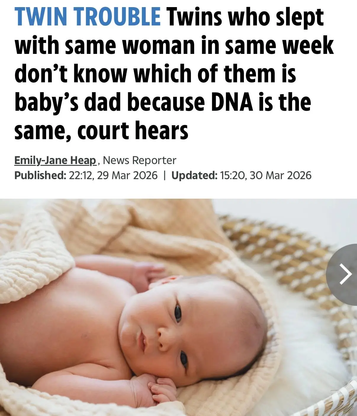 Ситуация. В Великобритании братья близнецы имели сексуальную связь с одной и той же женщиной с разницей в 4 дня. Она забеременела и теперь они не могут разобраться, кто из них отец , поскольку у них идентичная ДНК. С одним из братьев женщина сохраняла отношения, его имя внесено в свидетельство о рождении. В прошлом году дело попало в суд, потому что пара рассталась и нужно было установить точное отцовство. В итоге суд оставил имя в свидетельстве о рождении как есть, но освободил вероятного папашу от выполнения родительских обязанностей, так как нельзя было доказать его точное отцовство