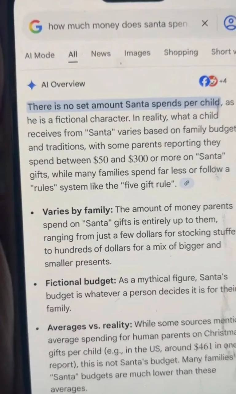 Искусственный интеллект стал новым Гринчем, который крадет Рождество. Дети ищут в интернете правду о Санта-Клаусе, а обзор на основе ИИ выдает им, что он вымышленный персонаж. Родители в шоке: 37-летняя Джанис Перес из Лас-Вегаса (на фото), чья дочь учится в третьем классе, рассказала, что это просто оскорбление для родителей. Она годами оттачивала почерк Санты, проверяла, чтобы дочь не нашла оберточную бумагу для подарков, старалась как могла, а Google своим обзором просто предал ее и других родителей, вот и все