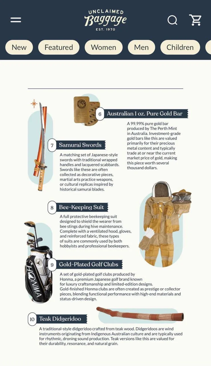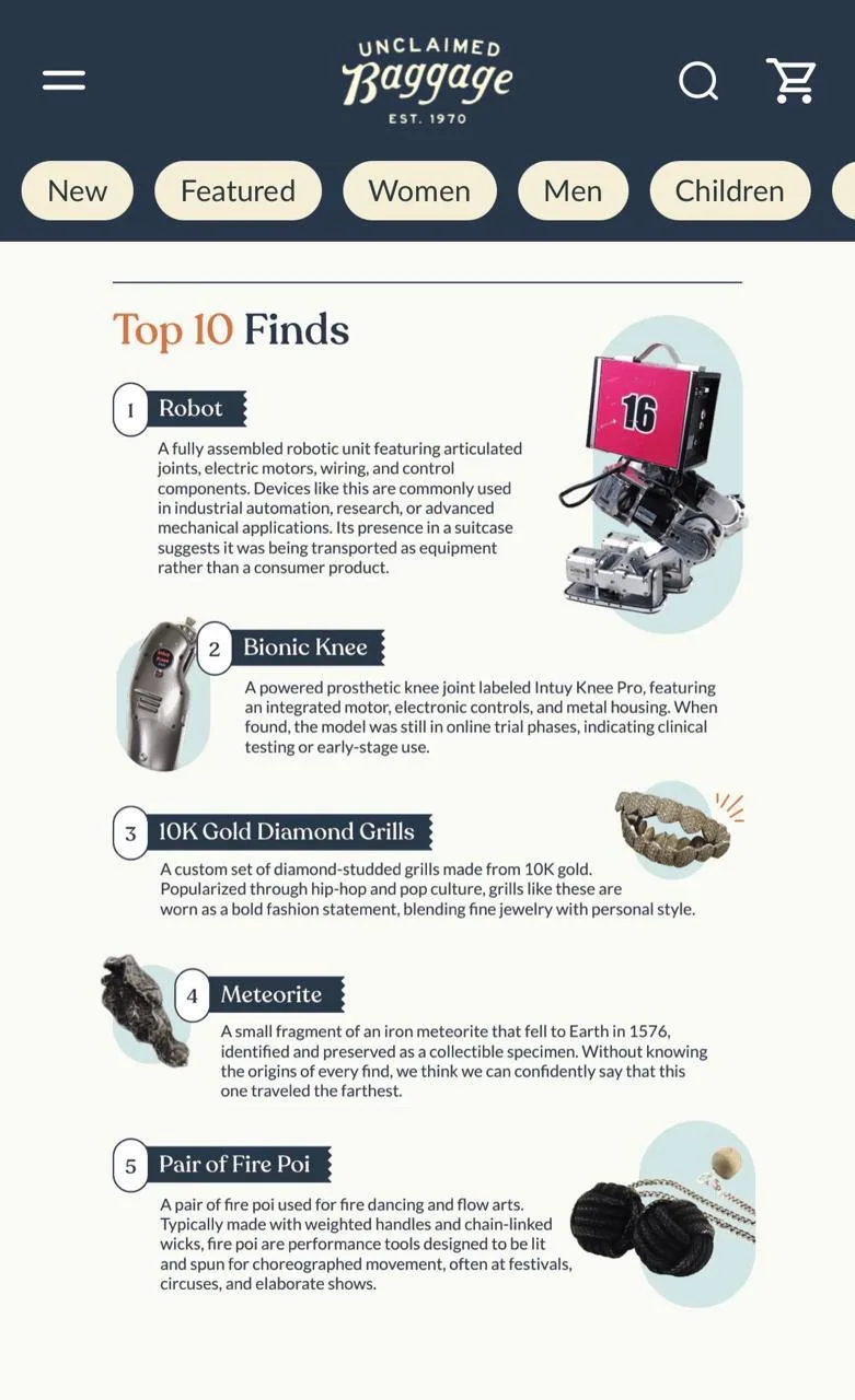 Самые странные вещи, забытые в самолетах и в аэропортах, ежегодно публикует в своем отчете компания Unclaimed Baggage. В этот раз в список попали: робот, бионическое колено, комплект бриллиантовых декоративных накладок на зубы, слиток чистого золота, набор позолоченных клюшек для гольфа, метеорит, штука для фаер-шоу под названием «пои», самурайские мечи, костюм для пчеловодства и музыкальный инструмент аборигенов Австралии. Все находки можно купить в магазине организации в Алабаме или онлайн