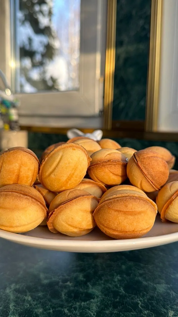 8. Орешки остудите и заполните варёной сгущёнкой, можно добавить орехи.