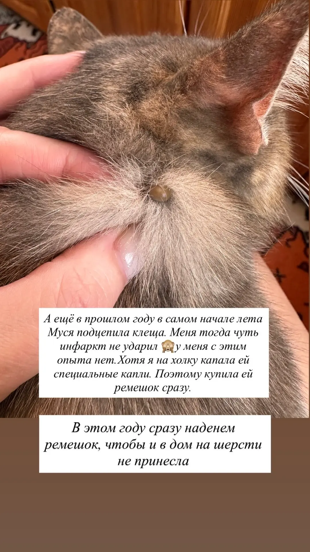 В прошлом году в самом начале лета наша Муся подцепила клеща. Честно, меня чуть инфаркт не стукнул. Во-первых они мне жутко противные , так я ещё очень сильно перепугалась за нее. Оказывается котам укус клеща не страшен. Но мне было сложно его снять.