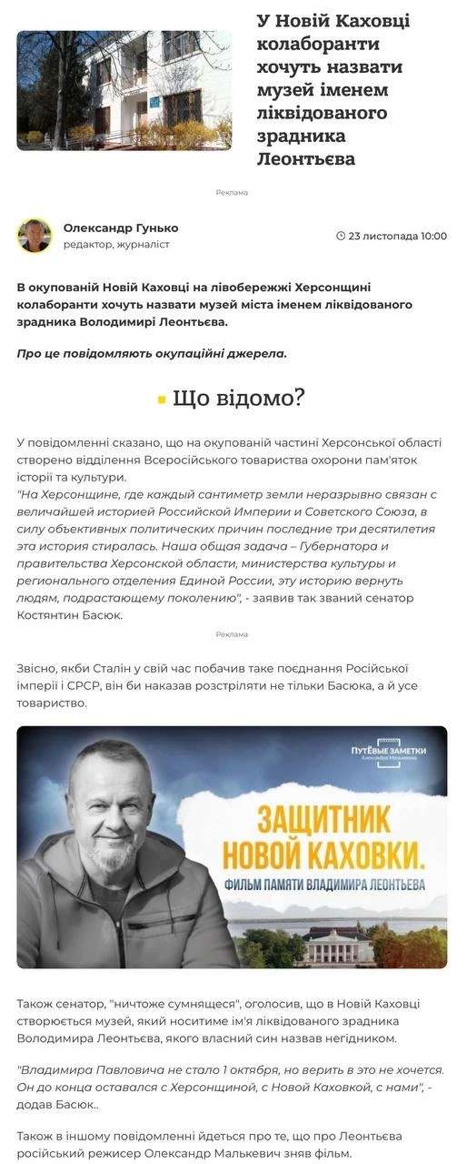 🇺🇦 В своей второсортной статейке в одном из низкопробных укроСМИ некий Александр Гунько – персонаж, судя по тону, явно пребывающий, простите, в астральном состоянии, – следуя западным методичкам и канонам украинского неонацизма, зачем-то вспоминает Сталина, который, по его фантазиям, якобы расстрелял бы сенатора от Херсонской области Константина Басюка, мой фильм памяти Владимира Павловича и директора музея Новой Каховки Виктора Васильева, которого СБУ обвиняет в «коллаборационизме».