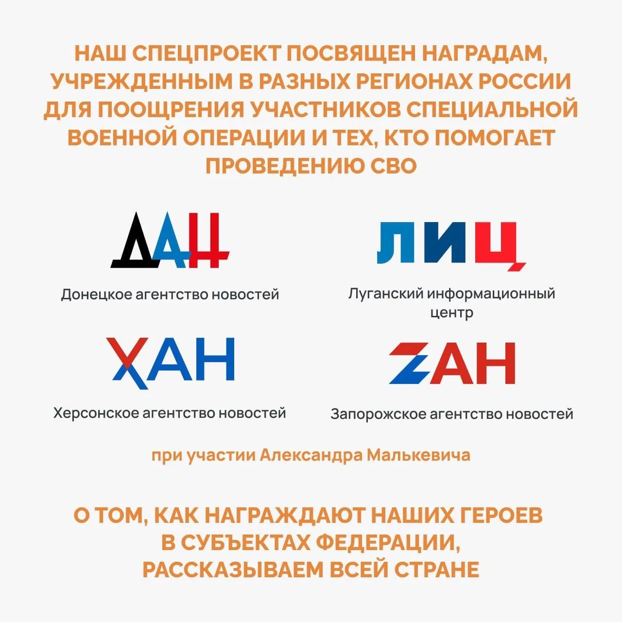 ⭐️ Спецпроект «СВО: Региональные награды» создан информационными агентствами Донбасса и Новороссии – ХАН, ДАН, ЛИЦ, ЗАН – совместно с журналистом Александром Малькевичем.