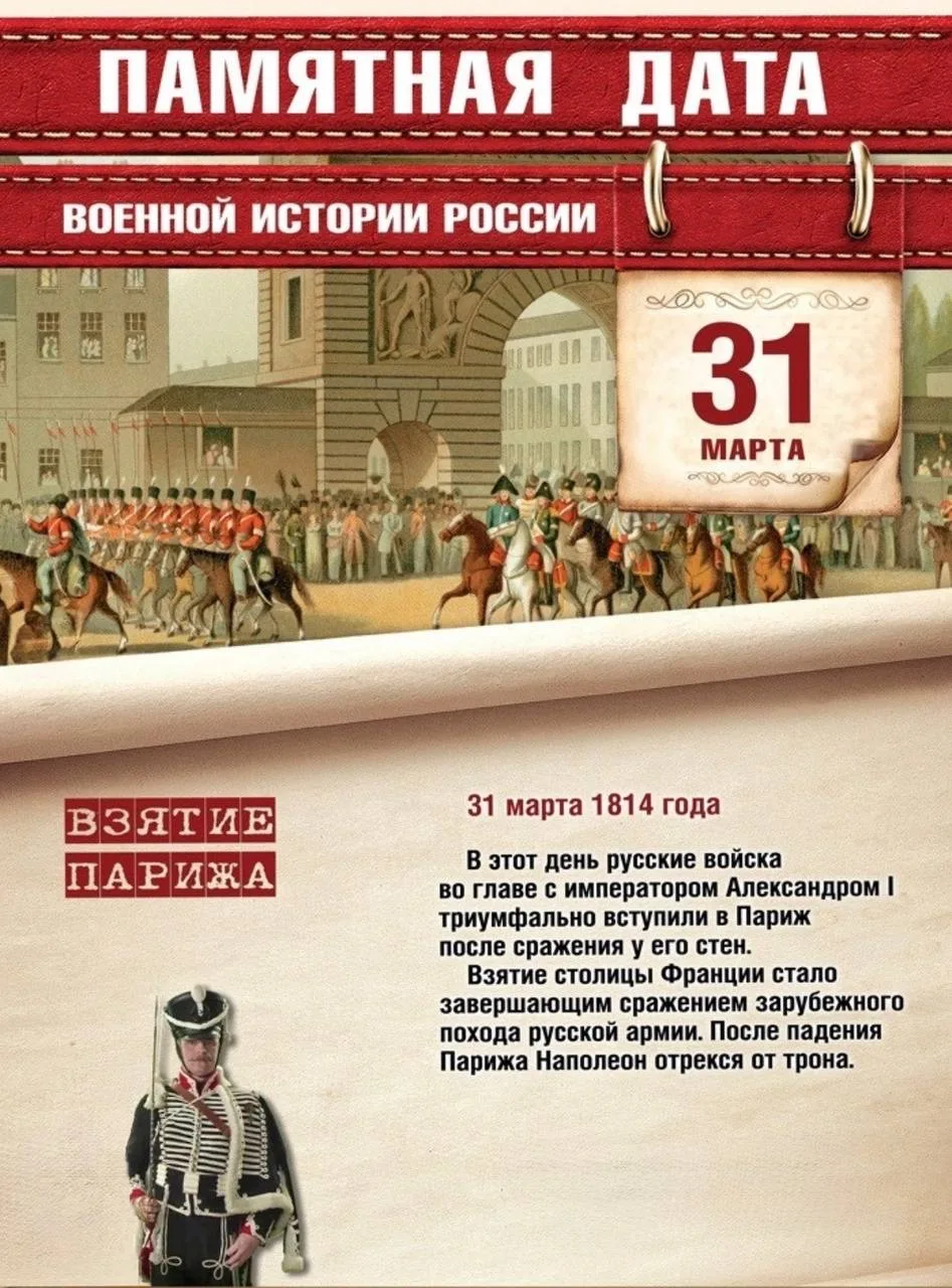 📆 31 марта – памятная дата военной истории России. В этот день в 1814 году русские войска и их союзники вступили в Париж. Европа была освобождена от владычества Наполеона