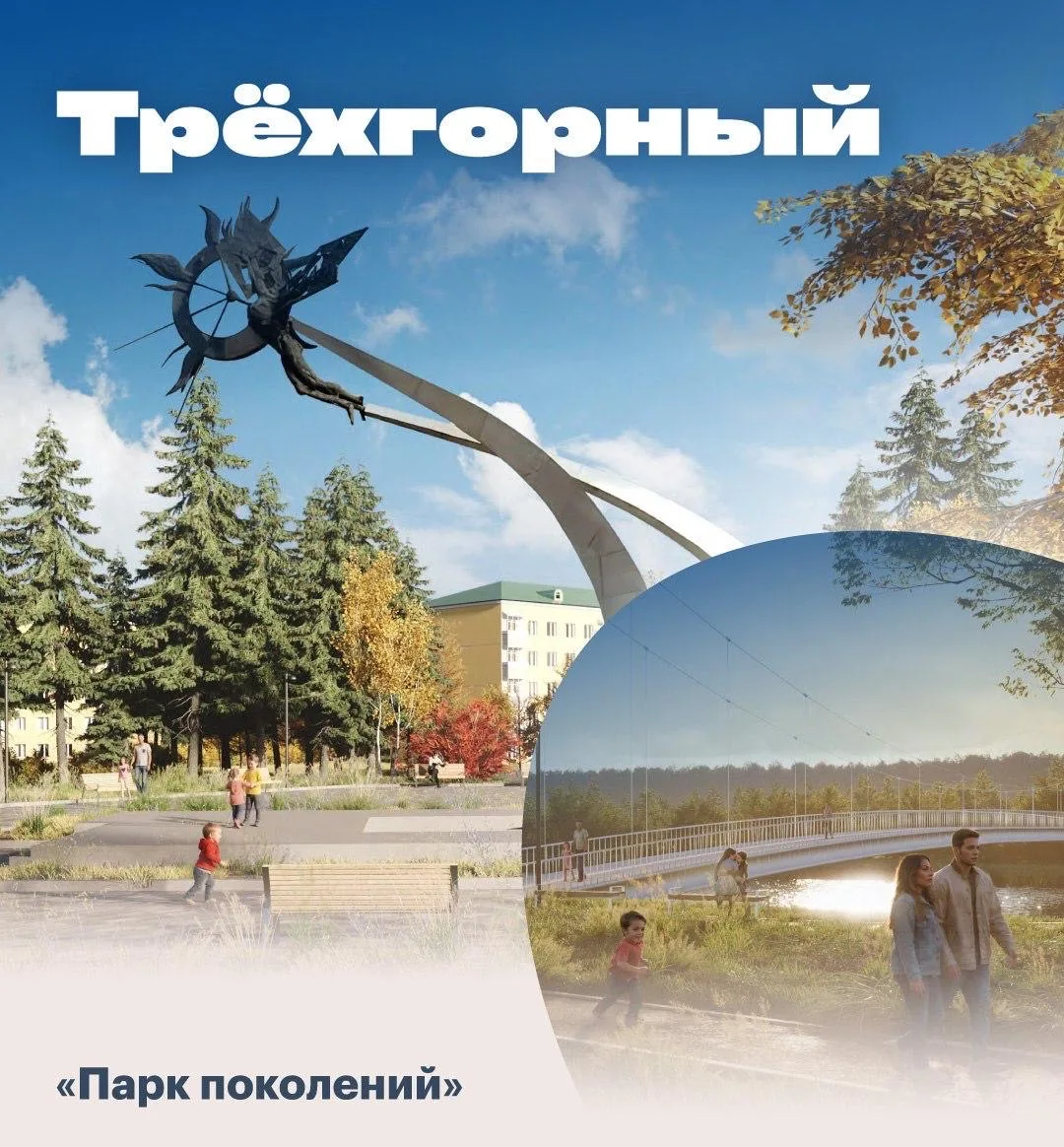 Трехгорный: «Парк поколений» свяжет уже благоустроенные пространства: парк культуры и отдыха, спортивный кластер со стадионом «Труд» и Тропу здоровья. У жителей города появится современный рекреационный маршрут, где все поколения смогут отдохнуть на свежем воздухе и найдут занятие по душе.