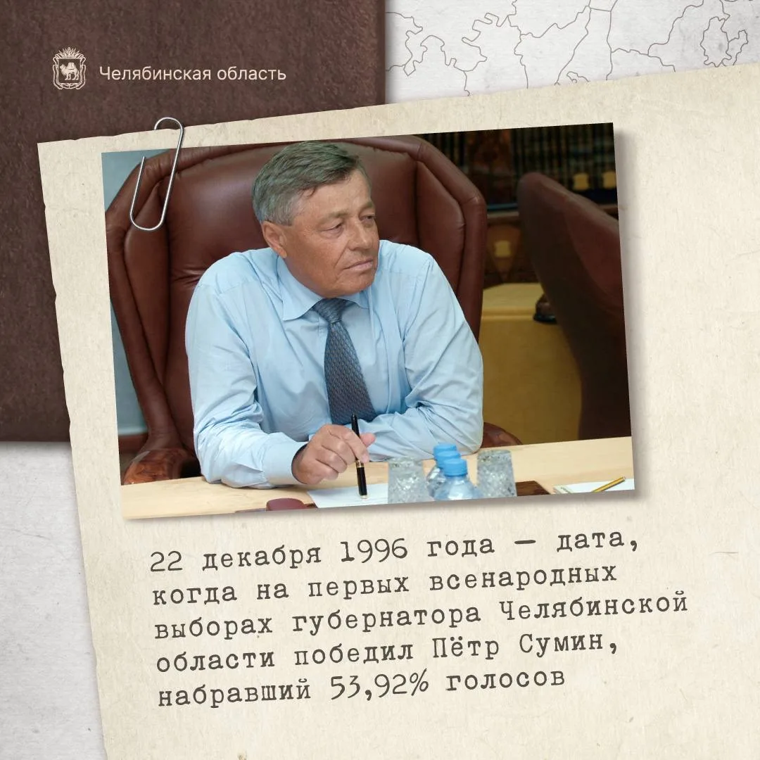 Исторический факт: 22 декабря 1996 года в Челябинской области прошли первые всенародные выборы губернатора. Победителем, получившим доверие более 53% избирателей, стал Пётр Сумин.