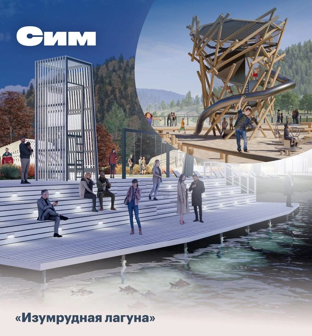 Сим: благодаря проекту «Изумрудная лагуна» город получит новое красивое пространство для прогулок и отдыха на берегу Симского пруда. Здесь появятся благоустроенный пляж, детская площадка, лыжероллерная трасса, домики и беседки для барбекю, пирс с арт-объектом, пешеходный мост и сцена.