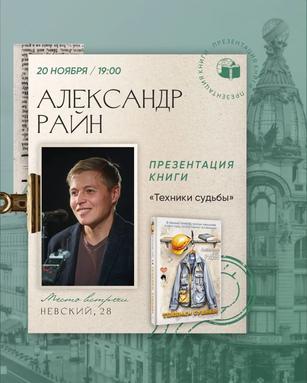 угое и никак не мог наглядеться. Голова кружилась так, что приходилось делать остановки, а еще нам тогда голуби на счастье бомбанули прямо на стаканчик с кофе. И вот мы пришли к нему — зданию Дома Книги (Зингер). Более оживленного места в Питере трудно сыскать. Двери там не закрывались ни на секунду. А внутри... Внутри царила сказочная суета: книги, открытки, галдеж, а еще выступал какой-то автор. Он рассказывал про свой новый роман. Как же мне было завидно! На тот момент я еще даже не работал под псевдонимом А. Райн, но уже знал, что хочу когда-нибудь выступить так же.