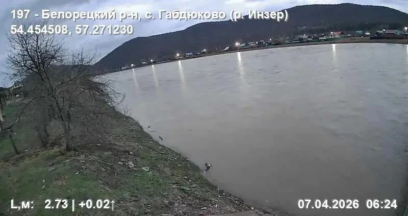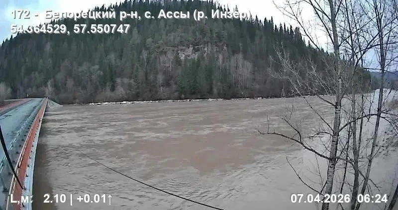 ⬆️на реке Инзер у села Устье-Бассы Архангельского района, динамика уровня воды +24 см, текущий уровень 301 см, выход реки на пойму 357 см.