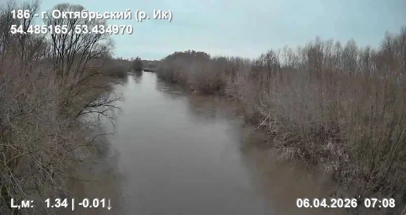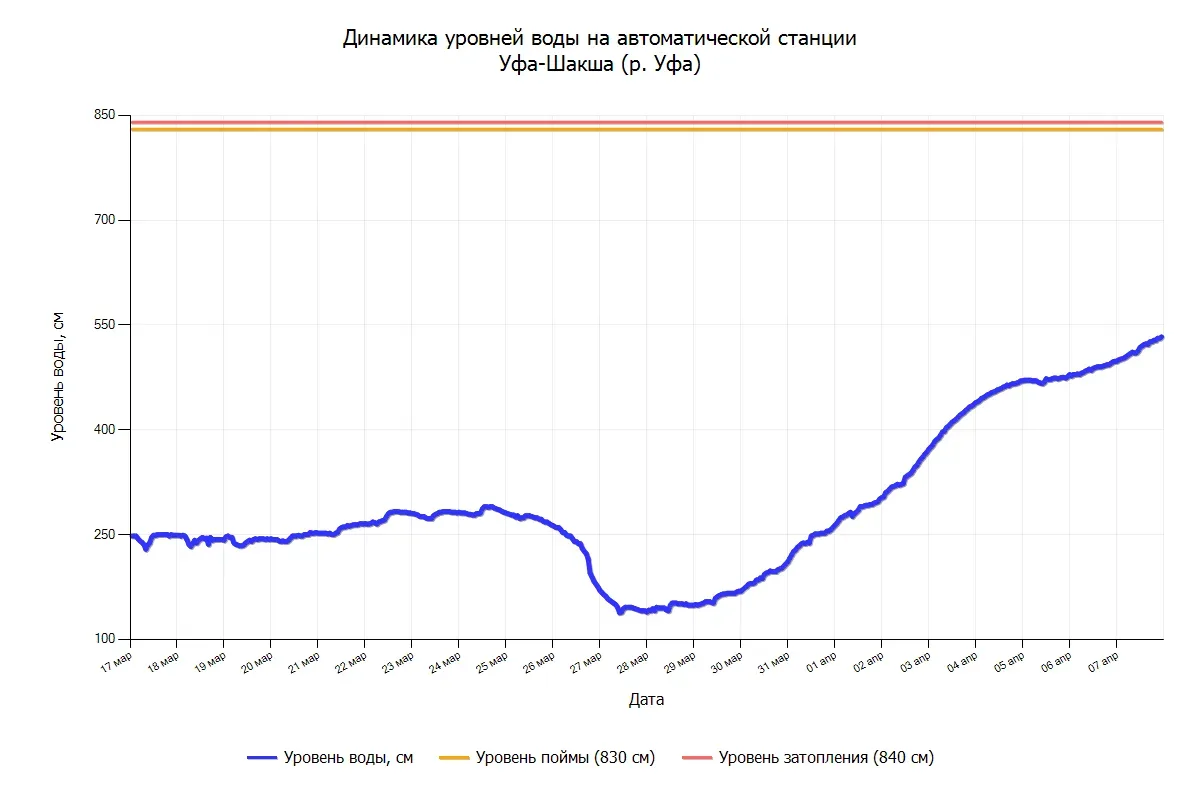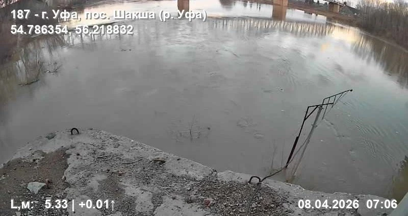 ⬆️на реке Уфе у микрорайона Шакша ГО г. Уфа, динамика уровня воды за сутки +34 см, текущий уровень 531 см, выход реки на пойму 830 см;