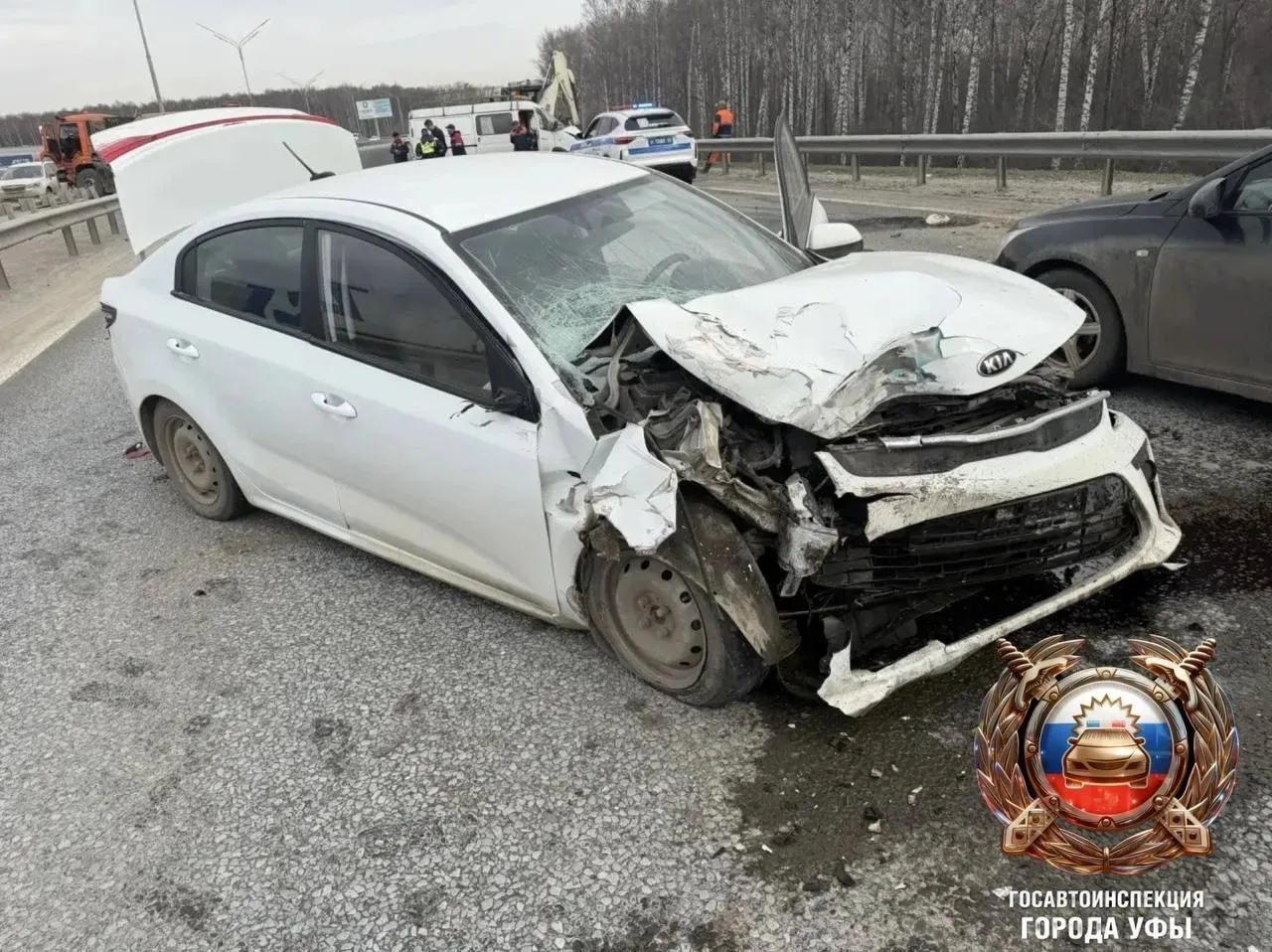 На видео видно, как на трассе «Уфа-Оренбург» Kia Rio врезается в поливомоечную машину, которая стояла на обочине, а после сталкивается с попутным Haval F7.