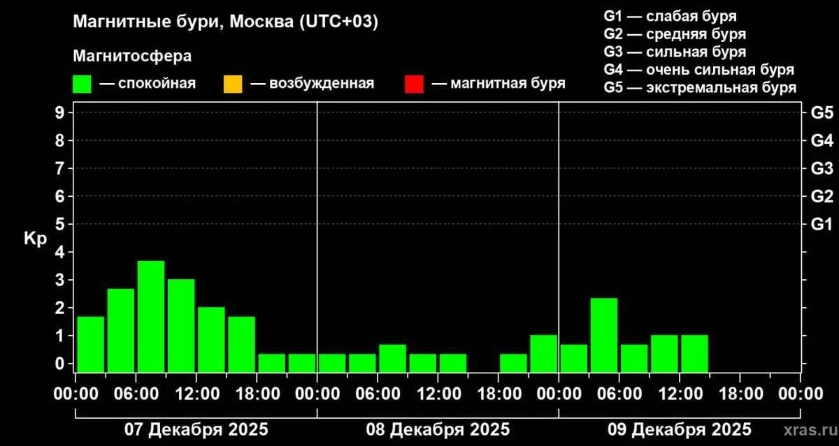 Пик возмущений прогнозируется на вторую половину дня 9 декабря. Высокая активность атмосферы позволит наблюдать полярные сияния в средних широтах, если не помешает облачность.