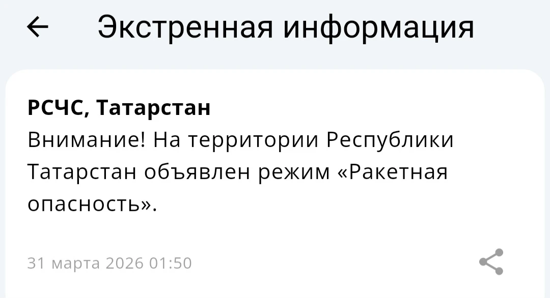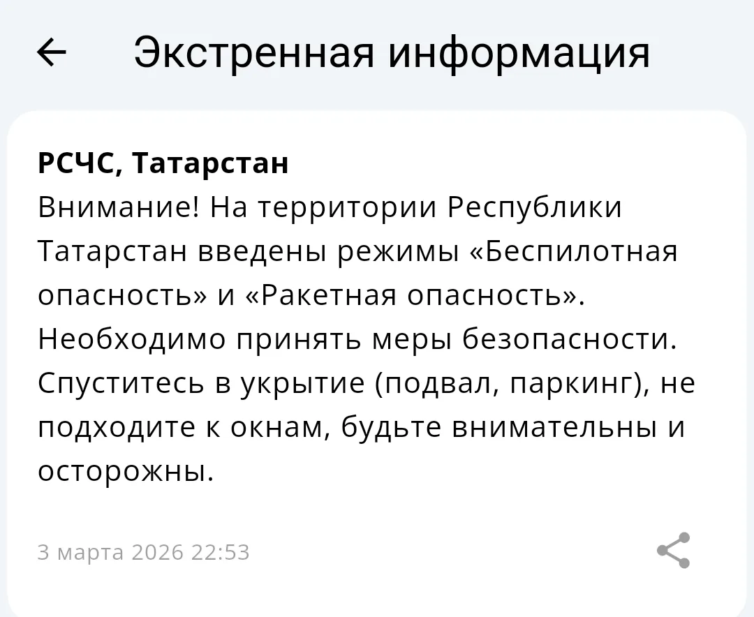 Экстренная информация РСЧС: Внимание! На территории Республики Татарстан введены режимы «Беспилотная опасность» и «Ракетная опасность». Необходимо принять меры безопасности. Спуститесь в укрытие (подвал, паркинг), не подходите к окнам, будьте внимательны и осторожны.