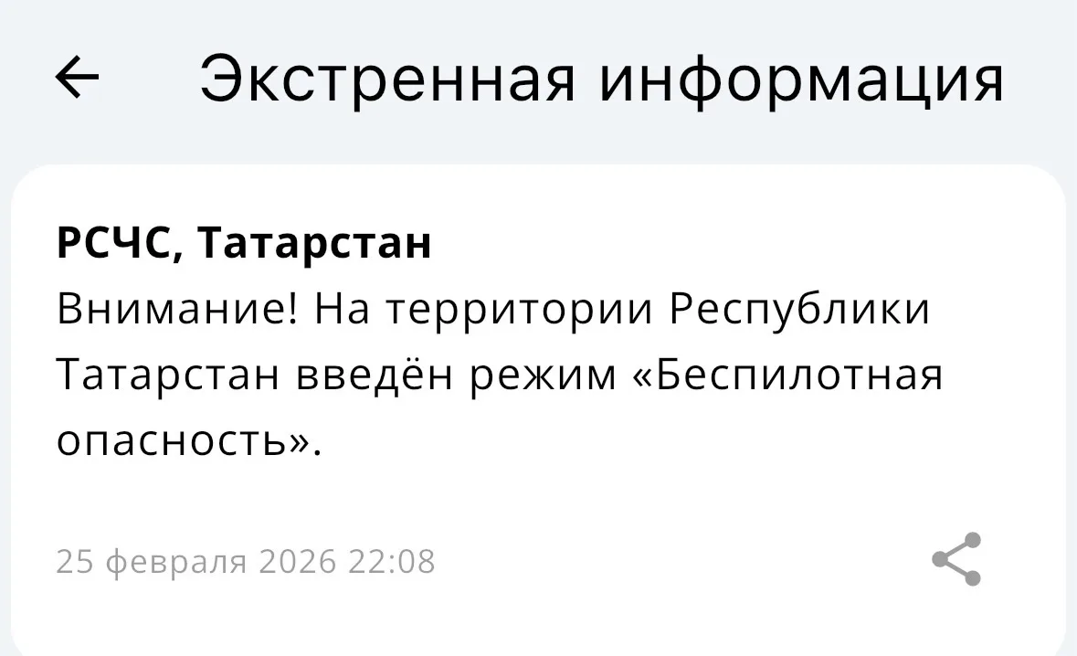 Экстренная информация РСЧС: Внимание! На территории Республики Татарстан введён режим «Беспилотная опасность».