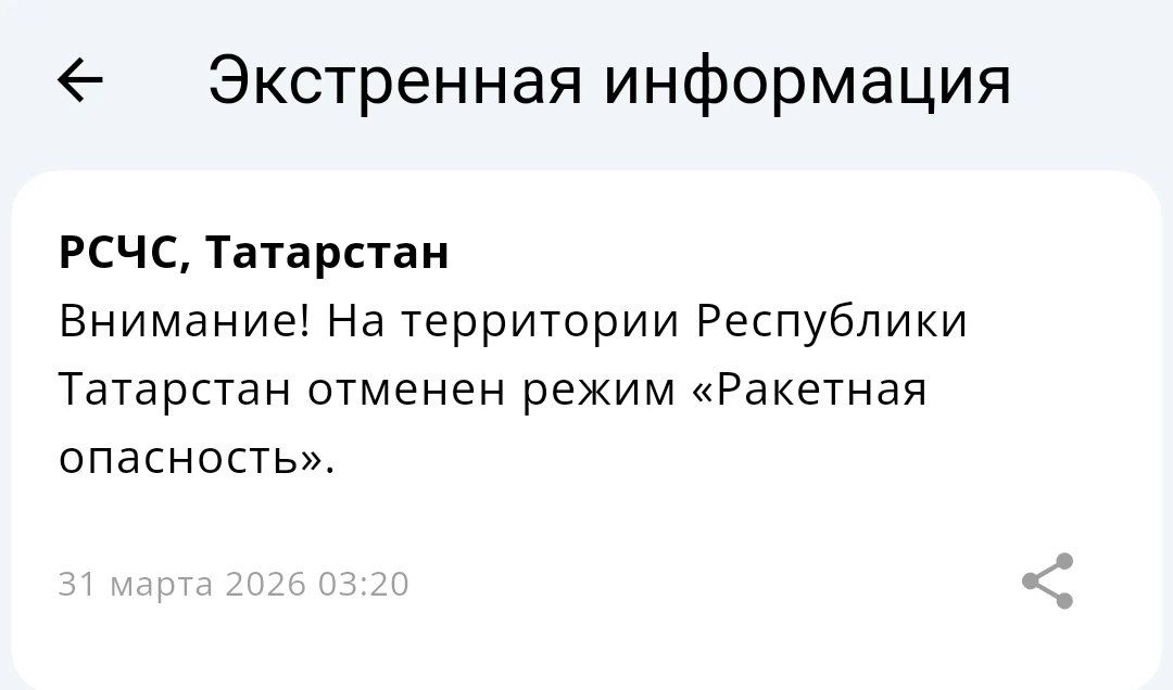 ❗️Отбой ракетной опасности в Татарстане — МЧС
