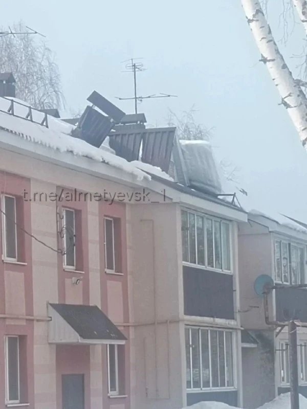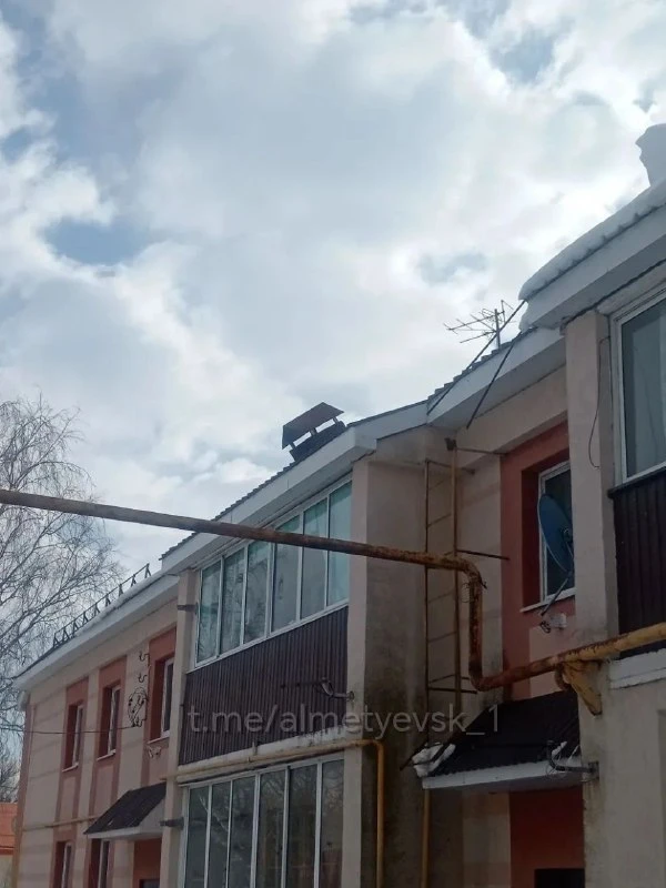 Труба вентиляции рухнула с крыши и образовала брешь в кровле дома в посёлке Альметьевского района