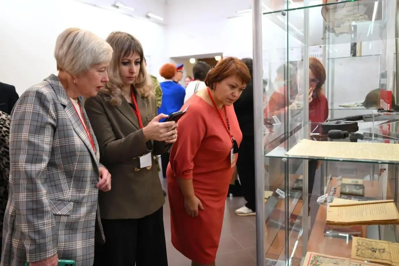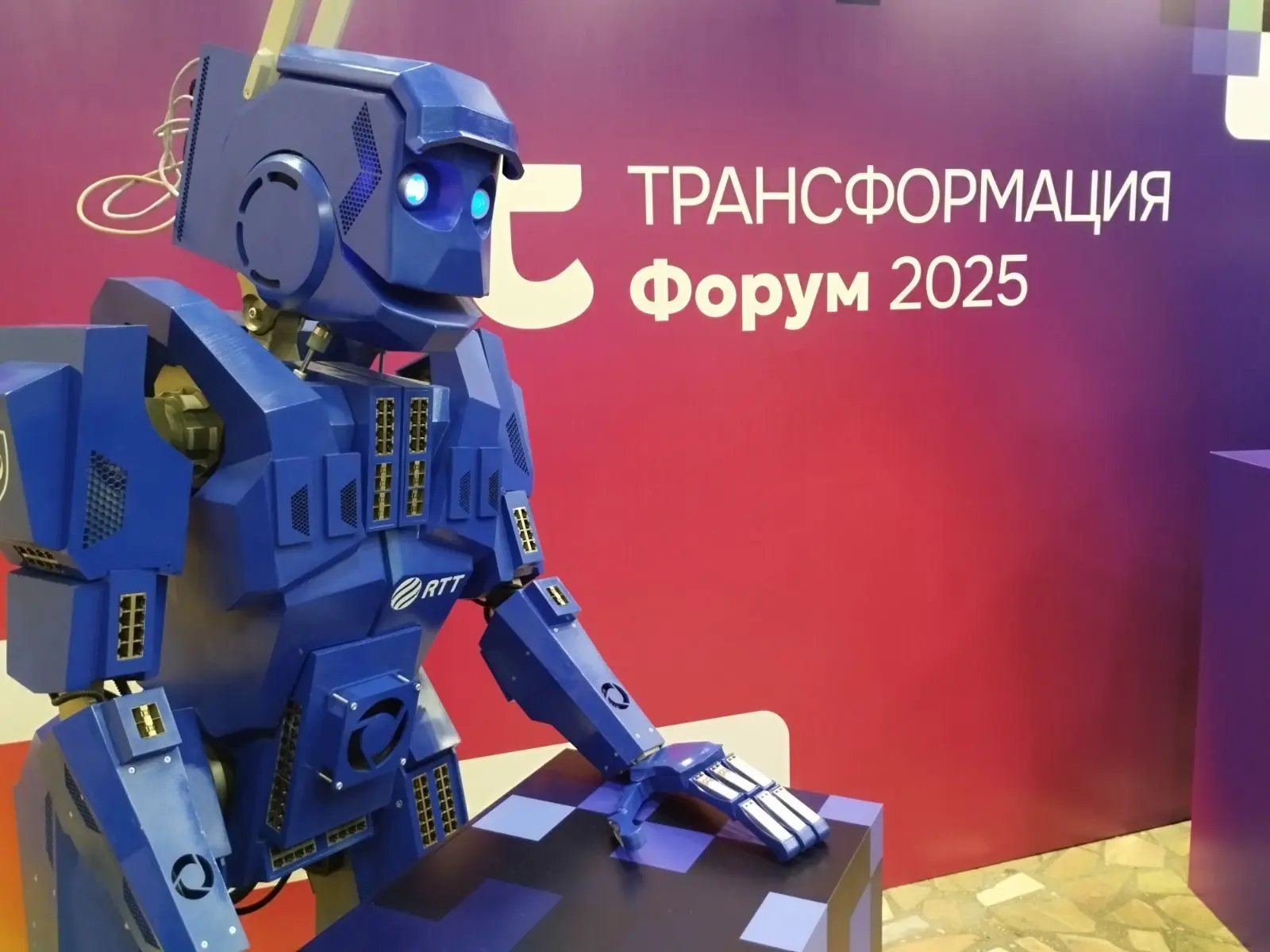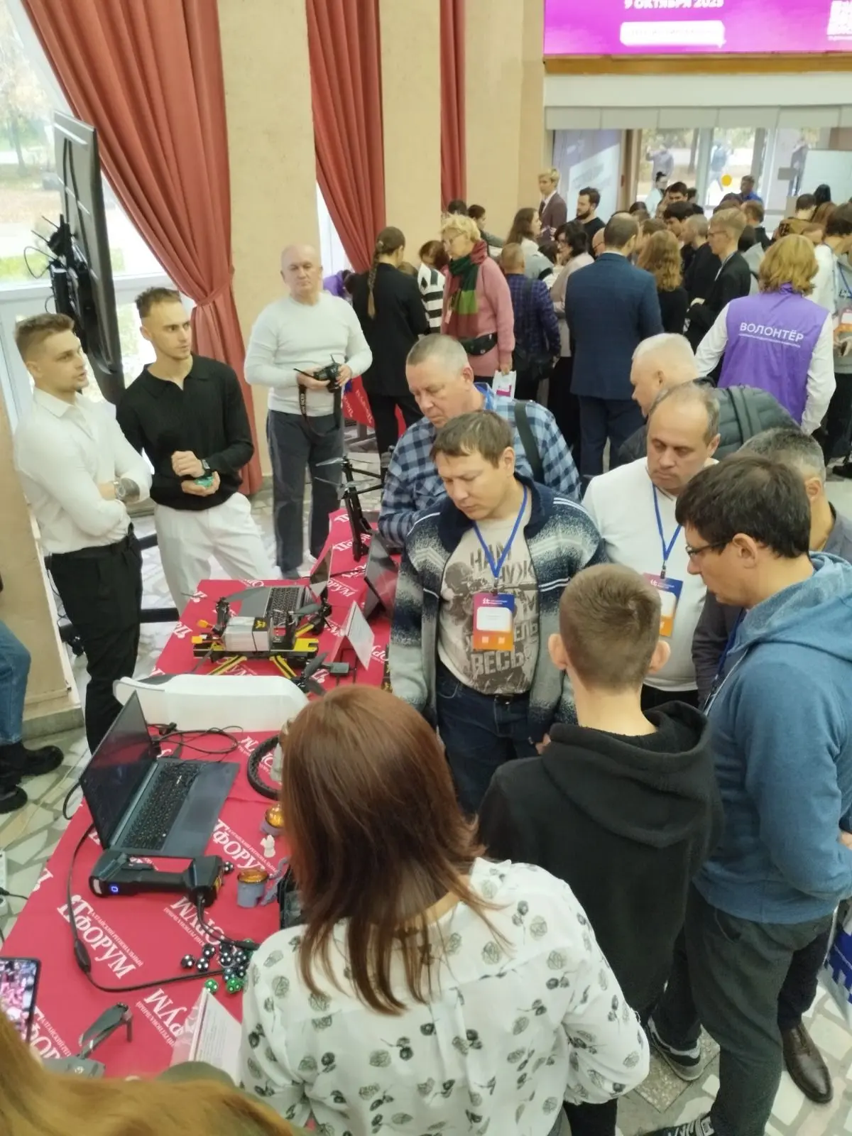 Уже идет регистрация участников, в фойе работает выставка беспилотников, VR-тренажеры, предметы ИИ-арта, стенд «Зеркало героев».