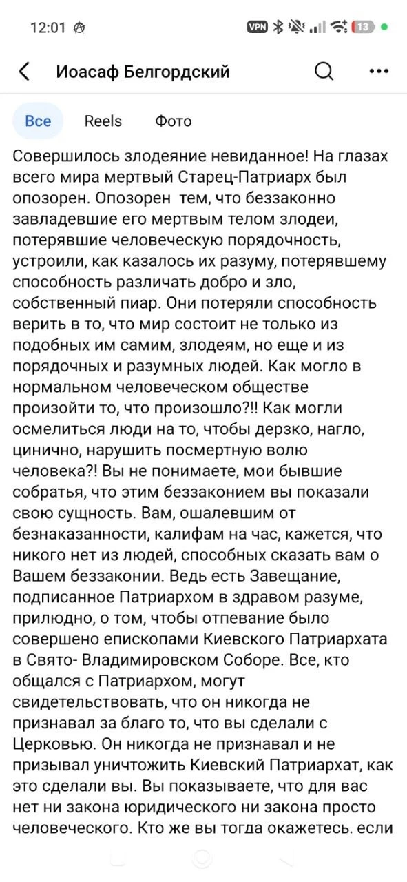 Теперь у «митрополита» Иосифа из «Киевского патриархата истерика». Он кричит у себя в ФБ, что Филарет опозорен, что ПЦУ злодеи, что они потеряли способность различать добро и зло. Говорит, это мы! Мы должны отпеть Филарета!