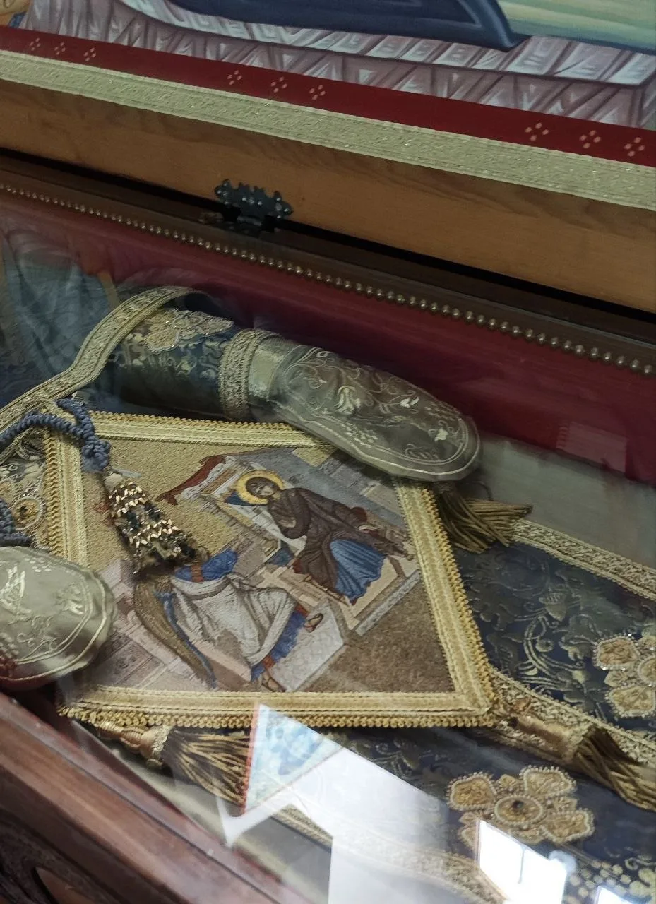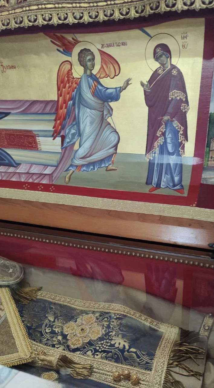 На крышке раки его мощей изображена икона Благовещения. Также Благовещение вышито на его палице.