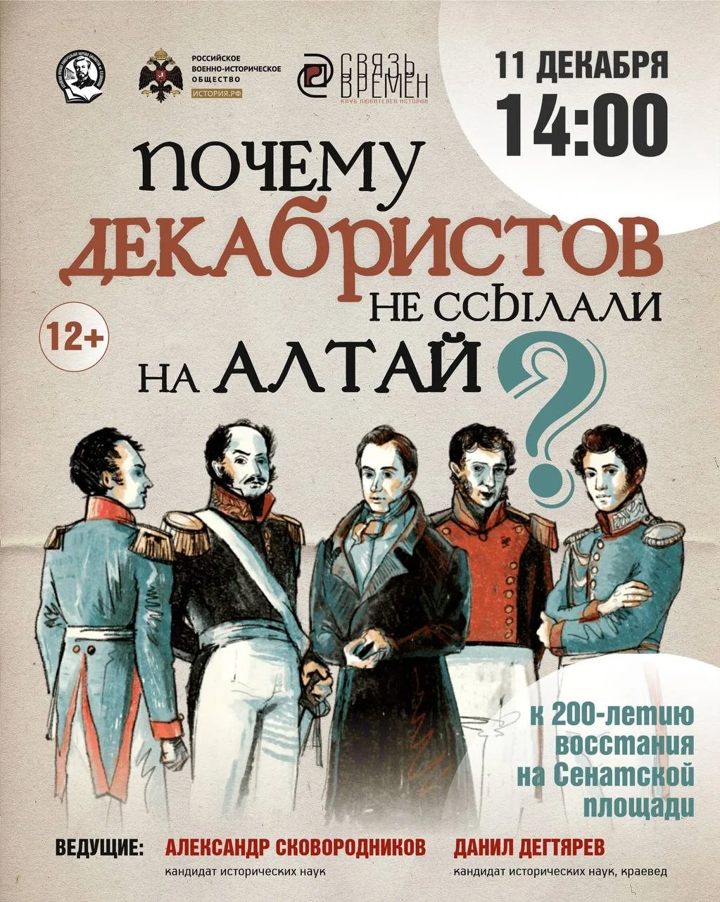 «Прошло уже 200 лет с тех пор, как в Петербурге прогремело восстание декабристов. Но до сих пор нет единого мнения: был ли это военный мятеж, дерзкая попытка дворцового переворота или первая искра революции? Выживших лидеров тайных обществ отправили в сибирскую ссылку — но почему не на Алтай? И вообще, имели ли декабристы отношение к нашему региону?», — гласит анонс встречи.