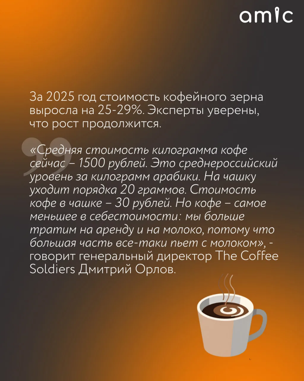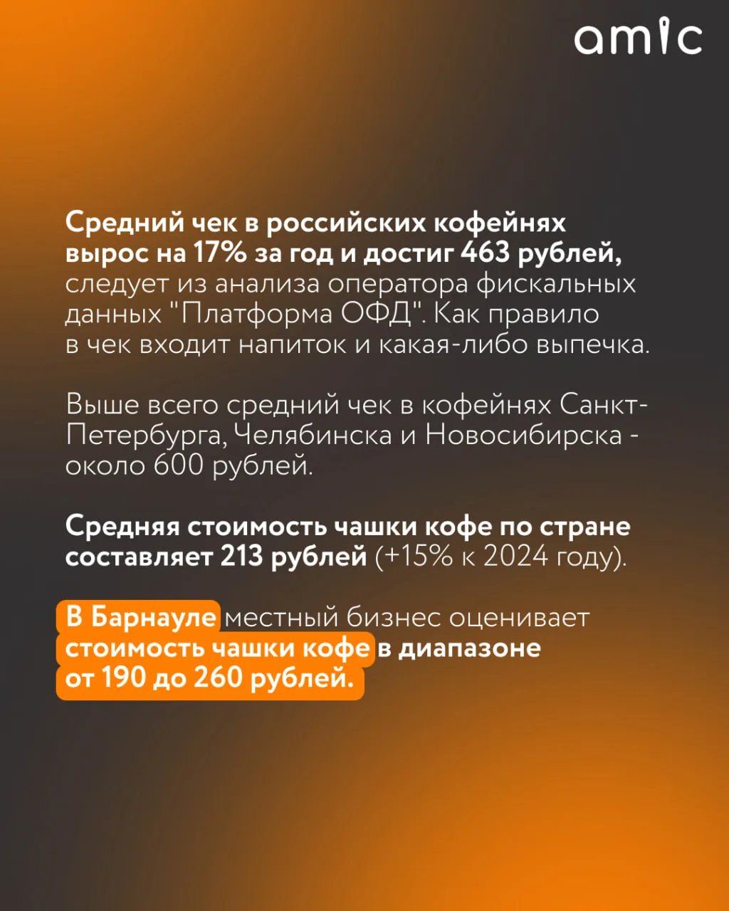 ☕️ Средний чек в кофейнях по стране вырос на 17% за год. Цена за чашку кофе подняла на 15%. А всего за месяц россияне выпивают 10,3 млн литров кофе.