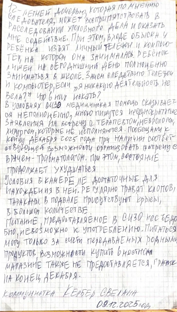 💬 «Я лишена возможности общаться с 12-летней дочерью. В ходе обыска у ребенка изъят личный телефон и компьютер <…>. Ребенок лишен [возможности] <…> полноценно заниматься в школе», - сообщила Светлана в письме, переданном через адвоката.