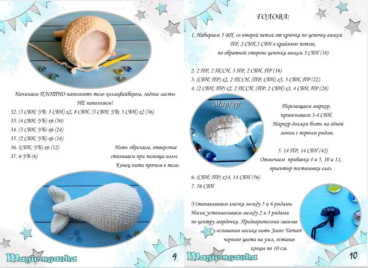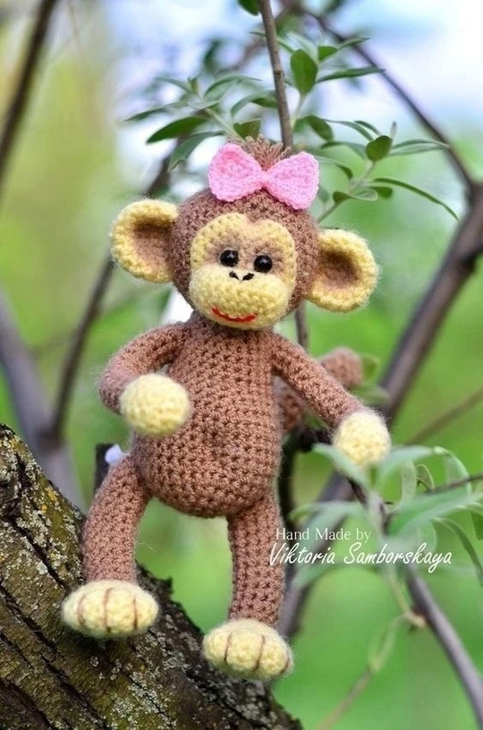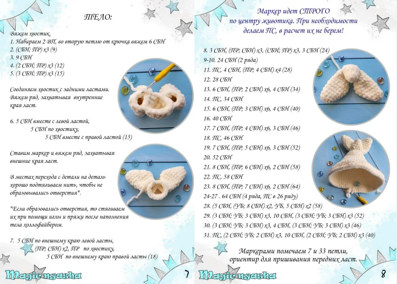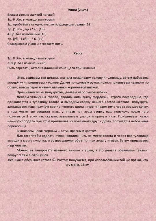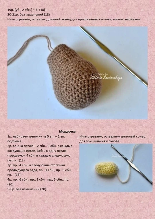 Набиваем игрушку наполнителем и сшиваем спинку за внутренние стенки сбн, этой же нитью вывязываем хвостик по схеме: набираем цепочку из 4вп, со второй петли 3сс, 6 вп, 5сс, 4вп, 3сс; делаем соединительный столбик в спинку игрушки, нить закрепляем, отрезаем, кончик прячем.